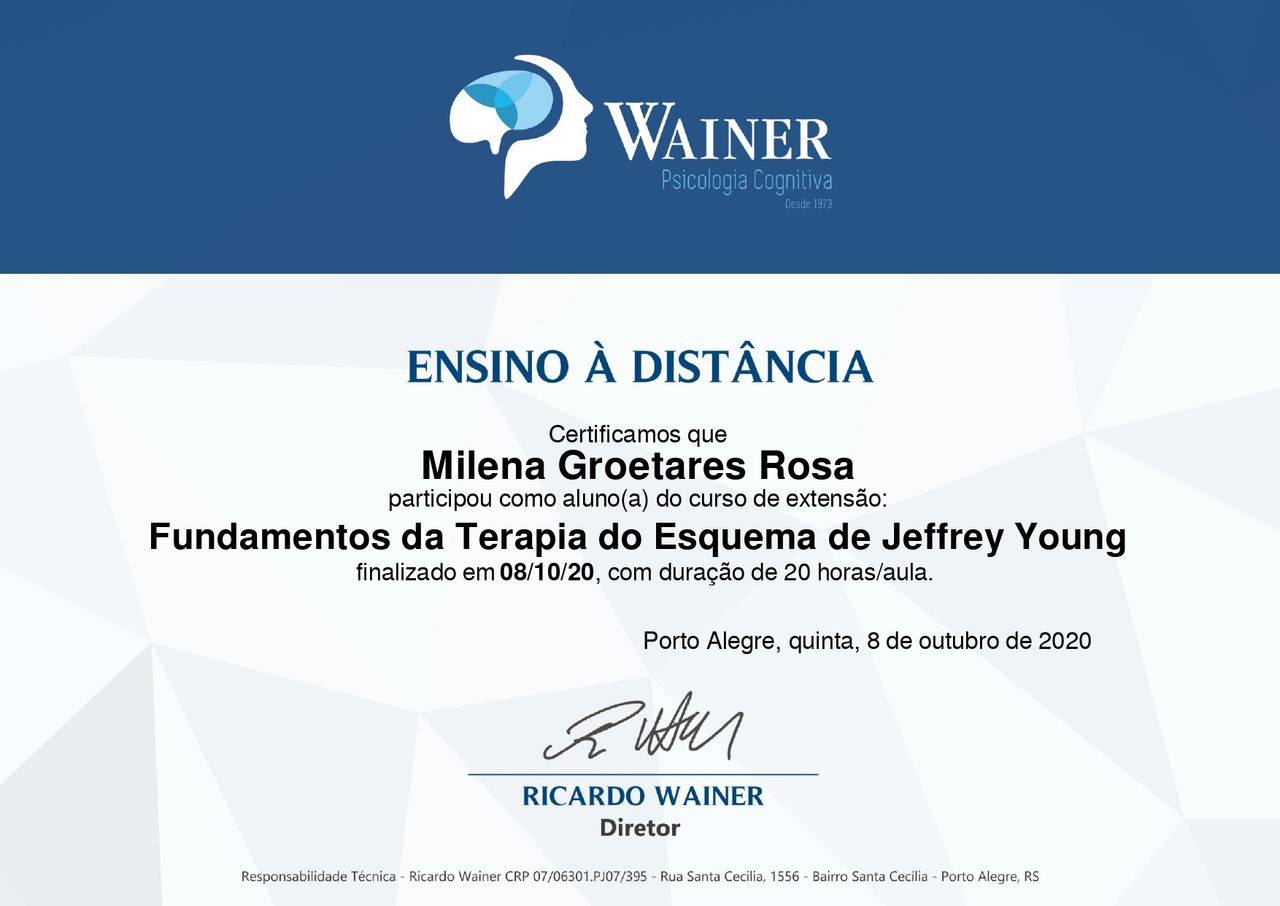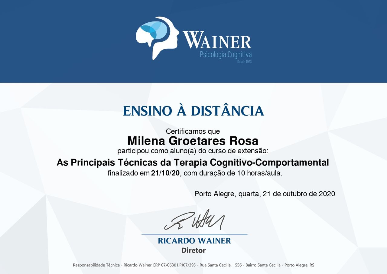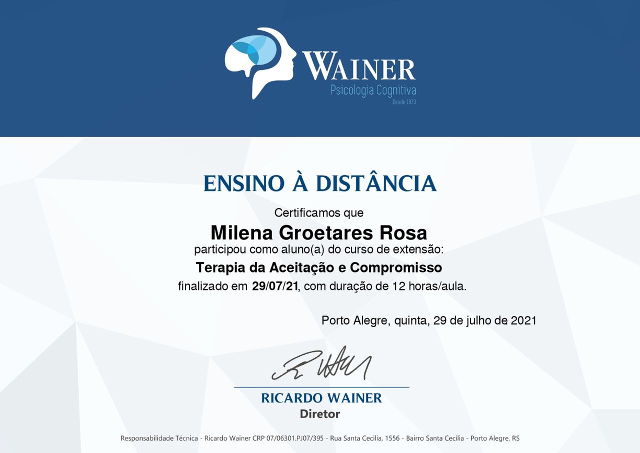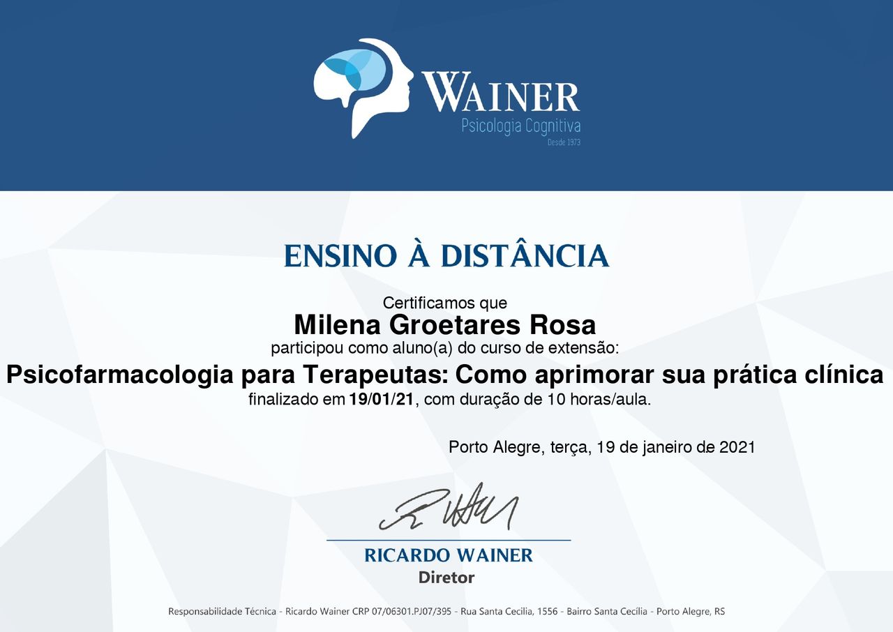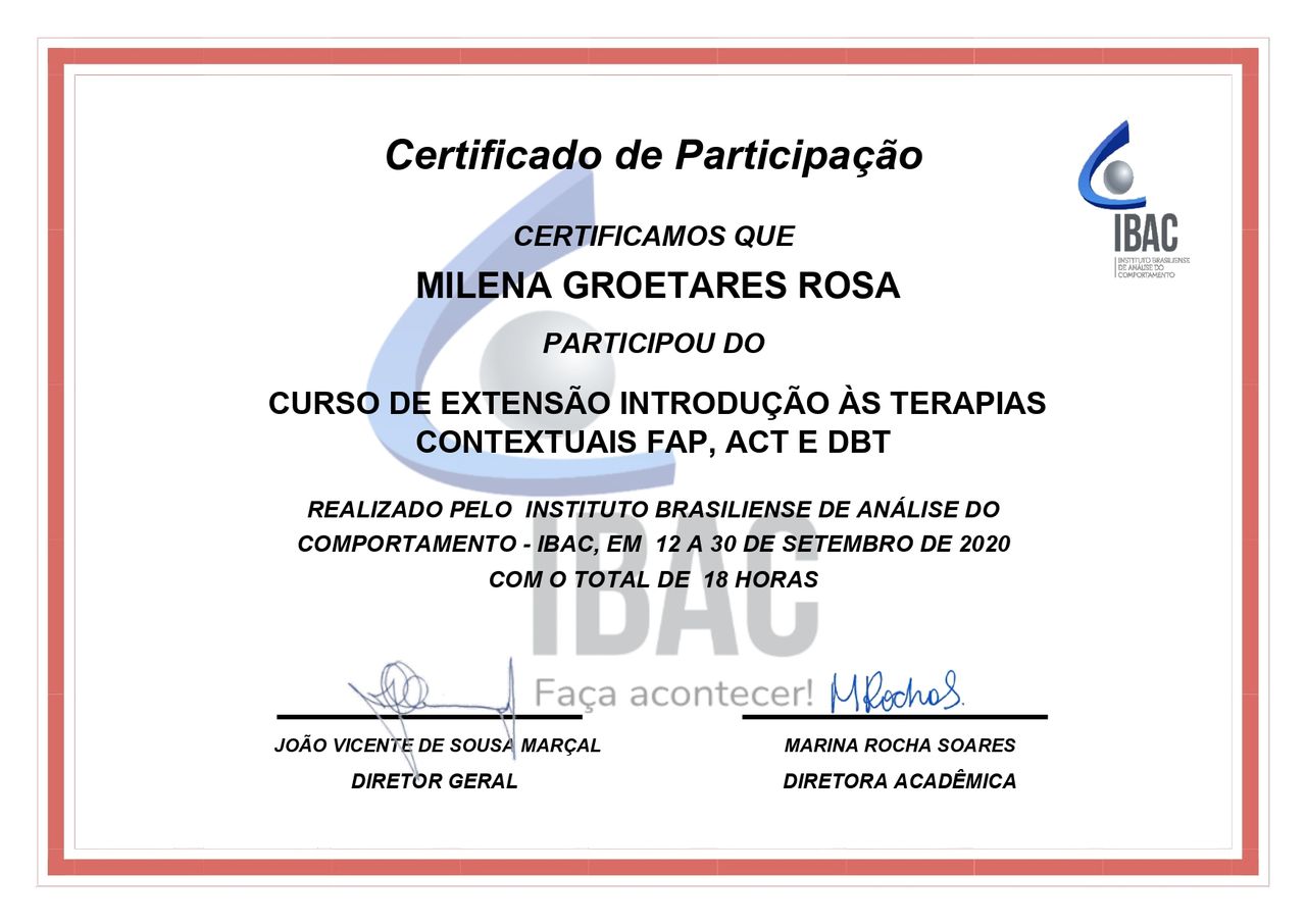 Quando poderia me consultar com Milena Groetares?Milena Groetares costuma ter horários disponíveis dentro da mesma semana ou para a semana seguinte. Verifique o calendário: você verá o primeiro horário disponível, atualizado em tempo real. Caso o horário sugerido não funcione para você, verifique outras datas. Agendar uma consulta é sempre imediato e gratuito.