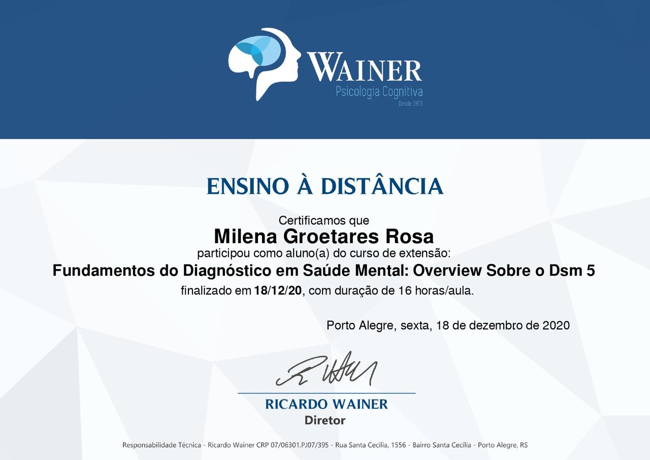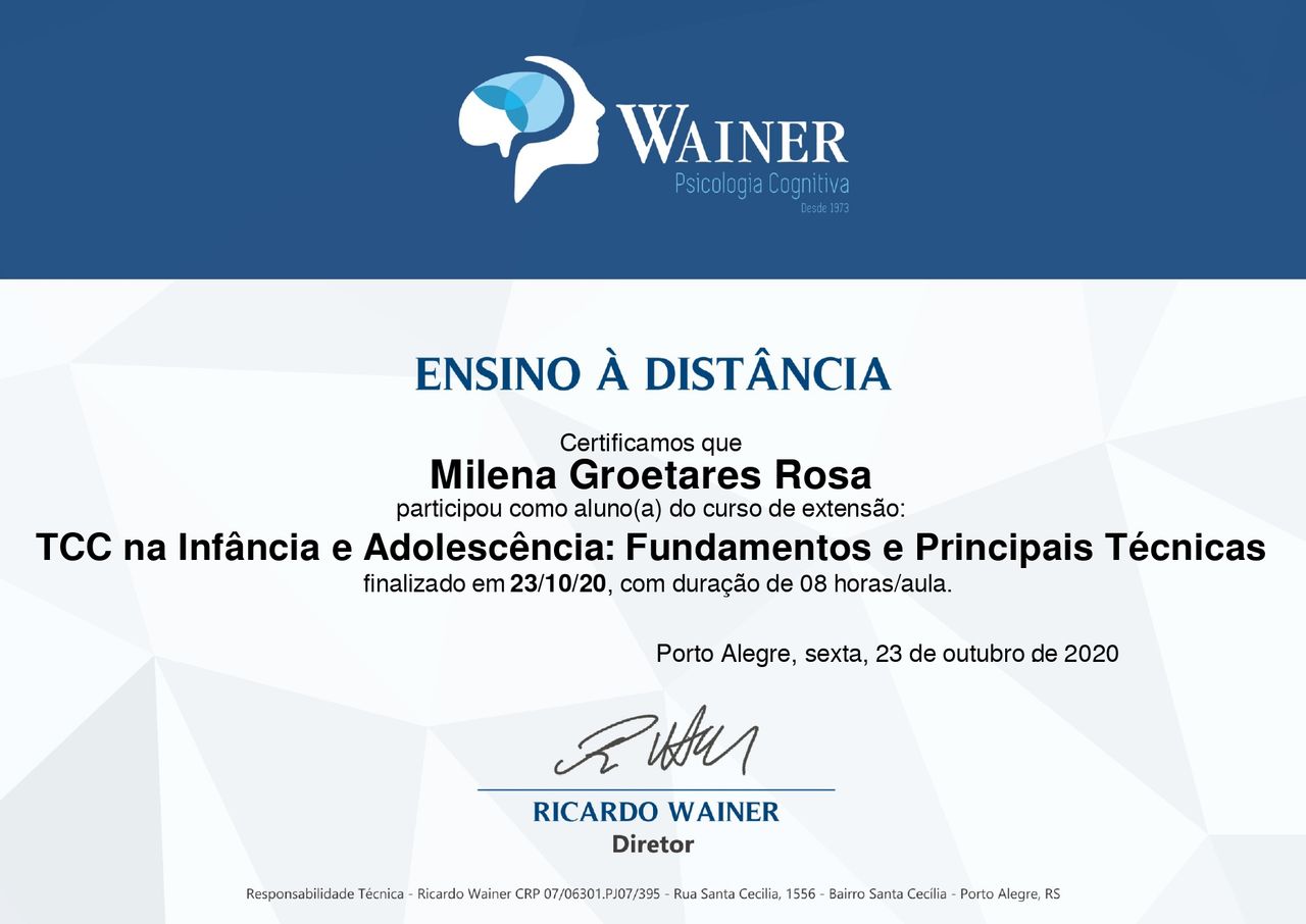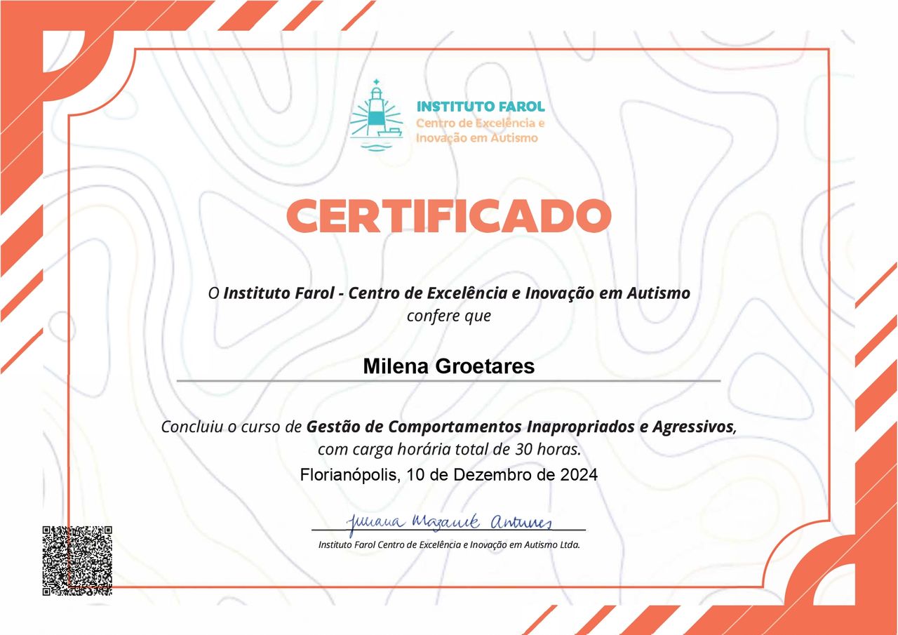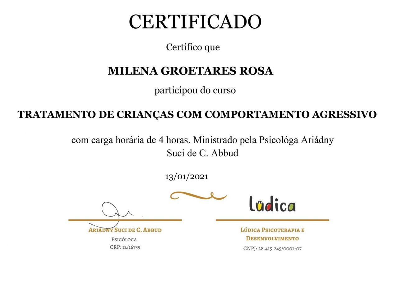 Quais são as principais especialidades de Milena Groetares?Milena Groetares é psicóloga. Te mostramos alguns dos serviços oferecidos pelo especialista graças à sua trajetória e vasta experiência: Teleconsulta, Primeira consulta psicologia, Avaliação de nível intelectual, Laudo Neuropsicológico, Avaliação neuropsicológica infantil, Transtorno de déficit de atenção e hiperatividade - TDAH, Avaliação psicológica, Avaliação de transtorno de TDAH, Terapia Cognitivo Comportamental, Avaliação neuropsicológica com detecção do espectro autista.