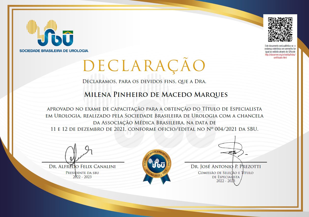 Sou Urologista, titular e membro da Sociedade Brasileira de Urologia, formada em Medicina pela UFMG em 2014.