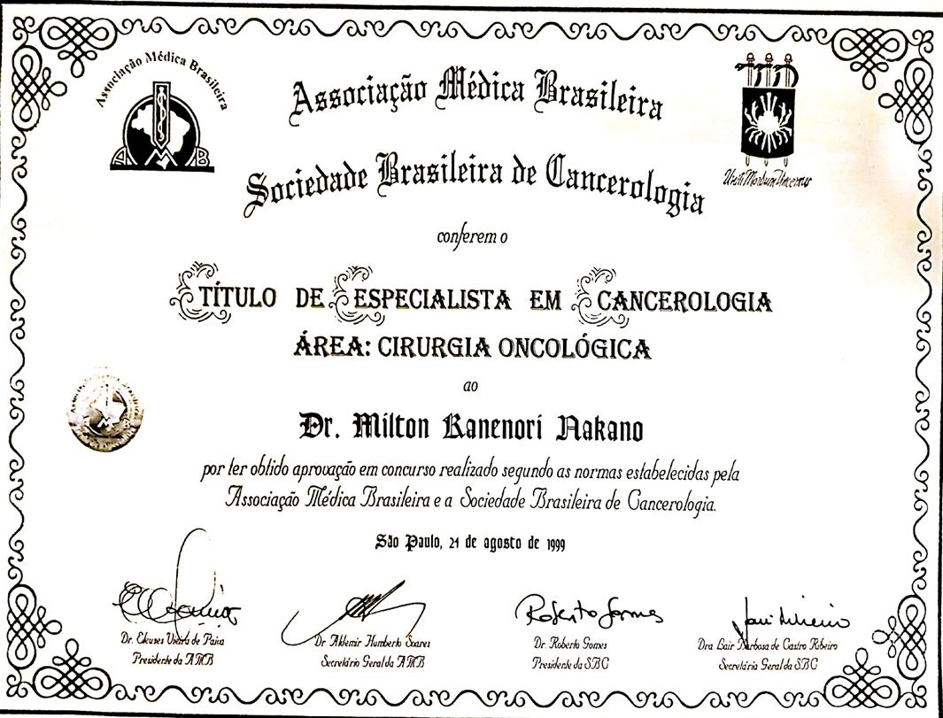 Tenho Título de Especialista em Cirurgia Geral pelo Colégio Brasileiro de Cirurgiões e Titulo de Especialista em Cancerologia Cirúrgica pela Sociedade Brasileira de Cirurgia Oncológica.