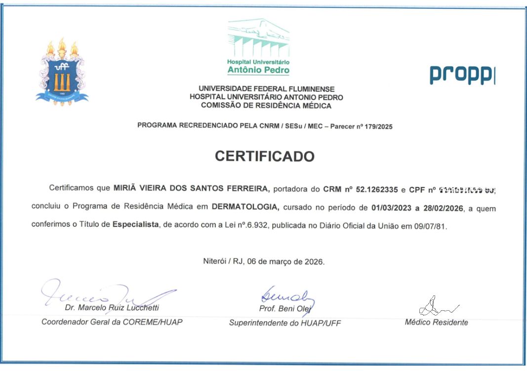 Especialista em Dermatologia Clínica e CirúrgicaFormada pela Universidade Federal FluminenseOs pacientes me avaliam como pontual
