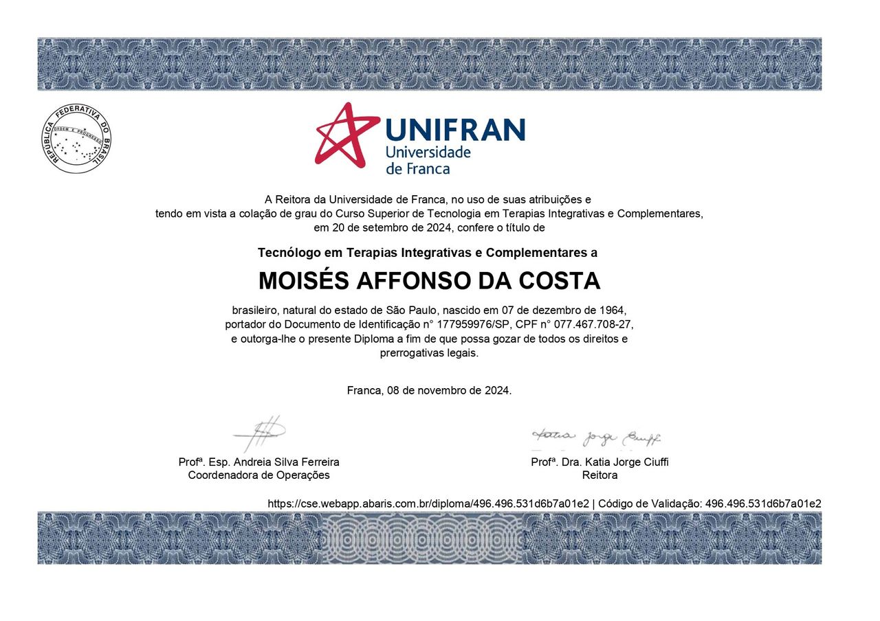 Quais são as principais especialidades de Moisés Affonso da Costa?Moisés Affonso da Costa é terapeuta complementar. Te mostramos alguns dos serviços oferecidos pelo especialista graças à sua trajetória e vasta experiência: Orientação profissional, Terapia Familiar, Terapia existencial, Terapia de Casal, Tratamento da ansiedade, Terapia online, Teleconsulta.