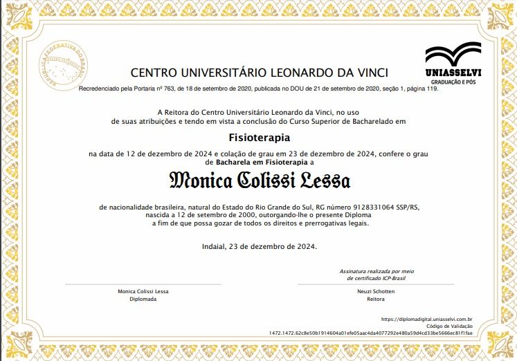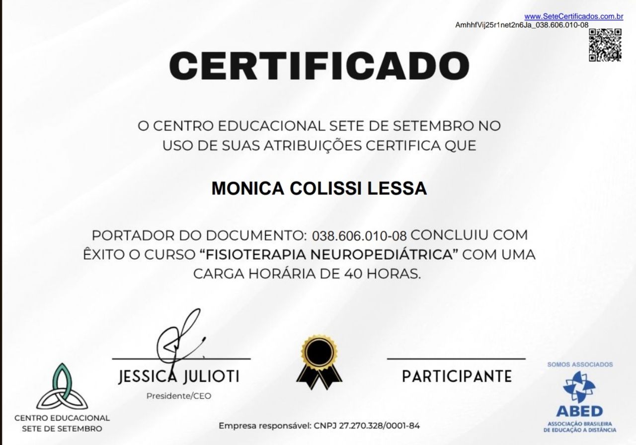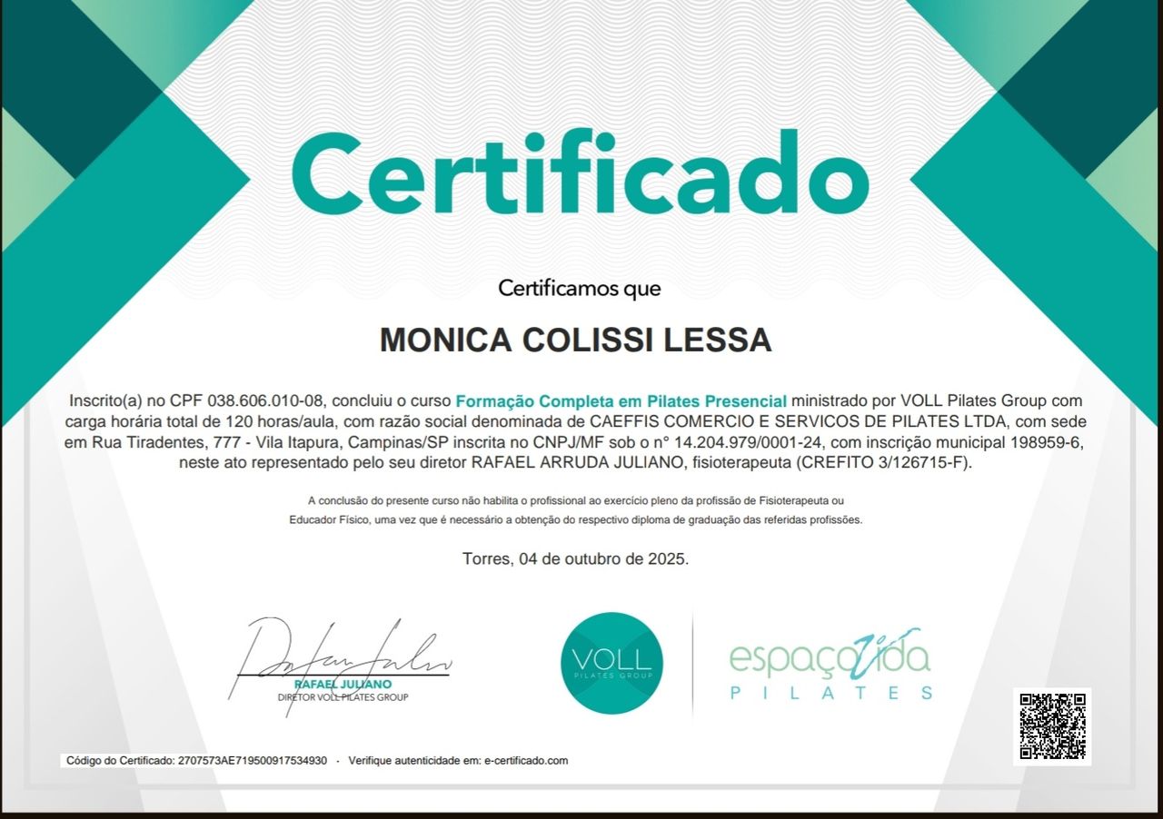 Quais são as principais especialidades de Monica Colissi Lessa?Monica Colissi Lessa é fisioterapeuta. Te mostramos alguns dos serviços oferecidos pelo especialista graças à sua trajetória e vasta experiência: Teleconsulta, Consulta Fisioterapia, Pilates com aparelhos e acessórios, Pilates, Primeira consulta Fisioterapia, Eletroterapia, Cinesioterapia, Consulta Fisioterapia Neurológica, Estimulação elétrica transcutânea, Fisioterapia para higiene brônquica.