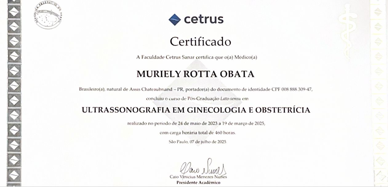 Quais são as principais especialidades de Muriely Rotta Obata?Muriely Rotta Obata é ginecologista. Te mostramos alguns dos serviços oferecidos pelo especialista graças à sua trajetória e vasta experiência: Consulta Ginecologia e Obstetrícia, Primeira consulta ginecologia e obstetrícia, Consulta de Pré-Natal.