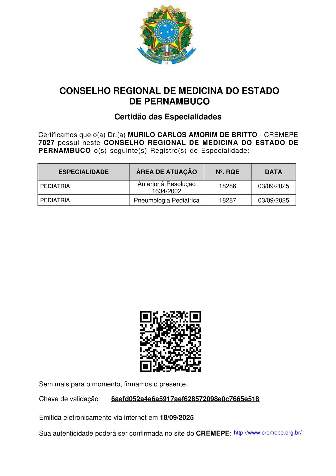 Dr. Murilo foi médico da minha filha quando criança e agora médico pneumologista da minha neta, sempre indico ele aos amigos e familiares porque tenho certeza da competência profissional.