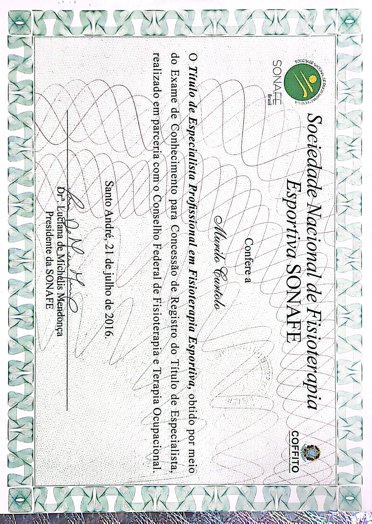 Membro da Sociedade Nacional de Fisioterapia Esportiva (SONAFE) (2016);