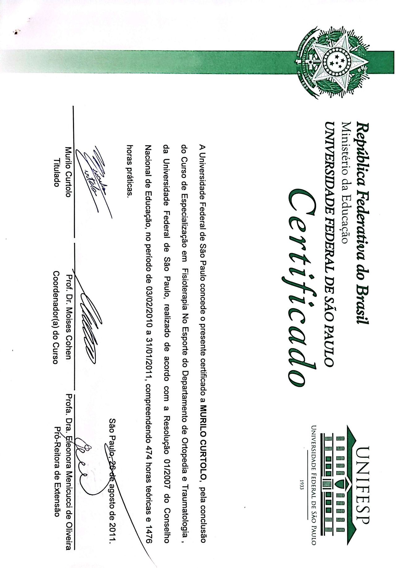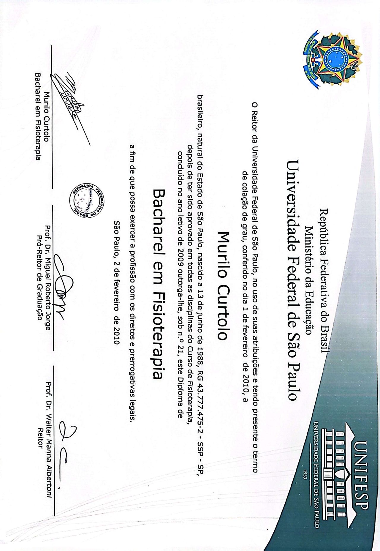 Fisioterapeuta graduado pela Universidade Federal de São Paulo – UNIFESP (2009);