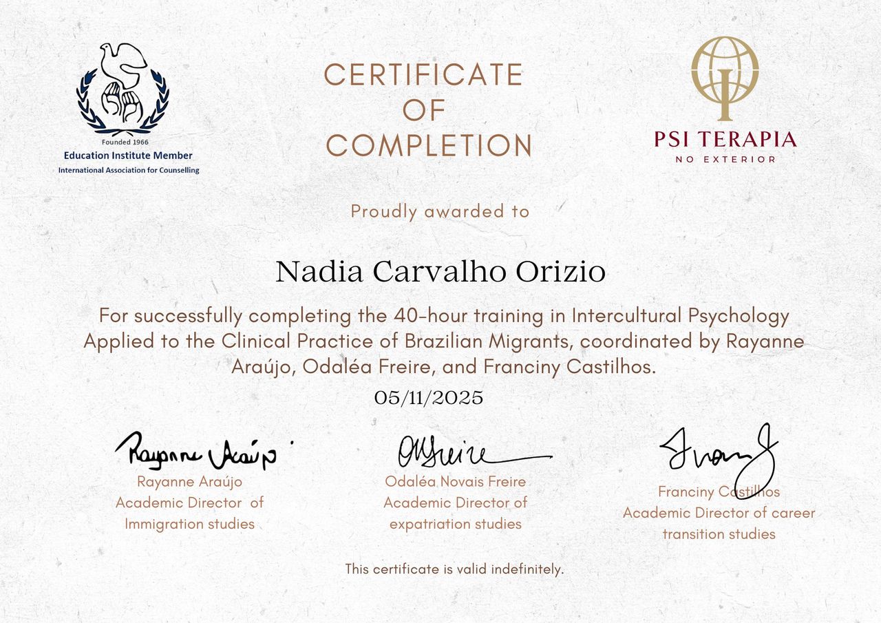 Em quais idiomas Nadia Carvalho Orizio atende?Nadia Carvalho Orizio atende em Português.