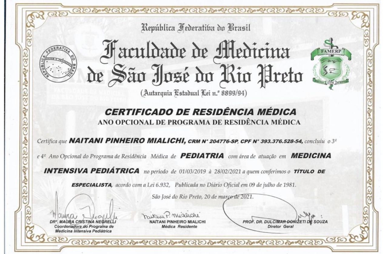 Quais são as principais especialidades de Naitani Mialichi?Naitani Mialichi é pediatra. Te mostramos alguns dos serviços oferecidos pelo especialista graças à sua trajetória e vasta experiência: Primeira consulta Pediatria, Acompanhamento de consulta pediatria geral, Atendimento domiciliar, Atençao para grupo de adolescentes, Atendimento a bebês prematuros, Urgência pediátrica, Primeira consulta Alergia Pediátrica, Atendimento a criança doente, Consulta pediatria, Consulta de retorno.