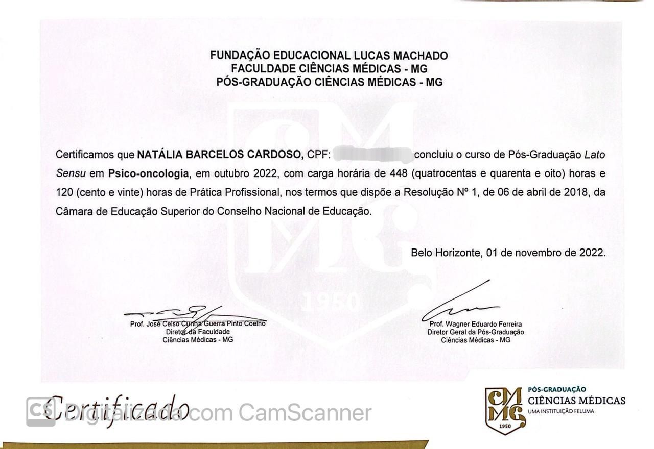 Quais são as principais especialidades de Natália Barcelos Cardoso?Natália Barcelos Cardoso é psicóloga. Te mostramos alguns dos serviços oferecidos pelo especialista graças à sua trajetória e vasta experiência: Teleconsulta, Atendimento em Psico-Oncologia à Crianças, Apoio ao paciente e familiar, Acompanhamento psicológico oncológico, Atendimento psicanalítico online para brasileiros que moram no exterior, Consulta em psicanálise online, Atendimento psicológico online, Psicoterapia online, Consulta de psicologia online, Terapia online.