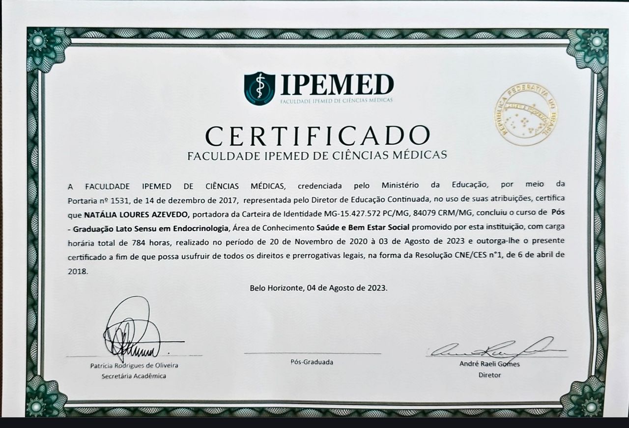 ◇ Pós-Graduada Lato Sensu em Endocrinologia e Metabologia, área de Conhecimento Saúde e Bem-Estar Social, pela Faculdade IPMED grupo AFYA - Belo Horizonte - MG.