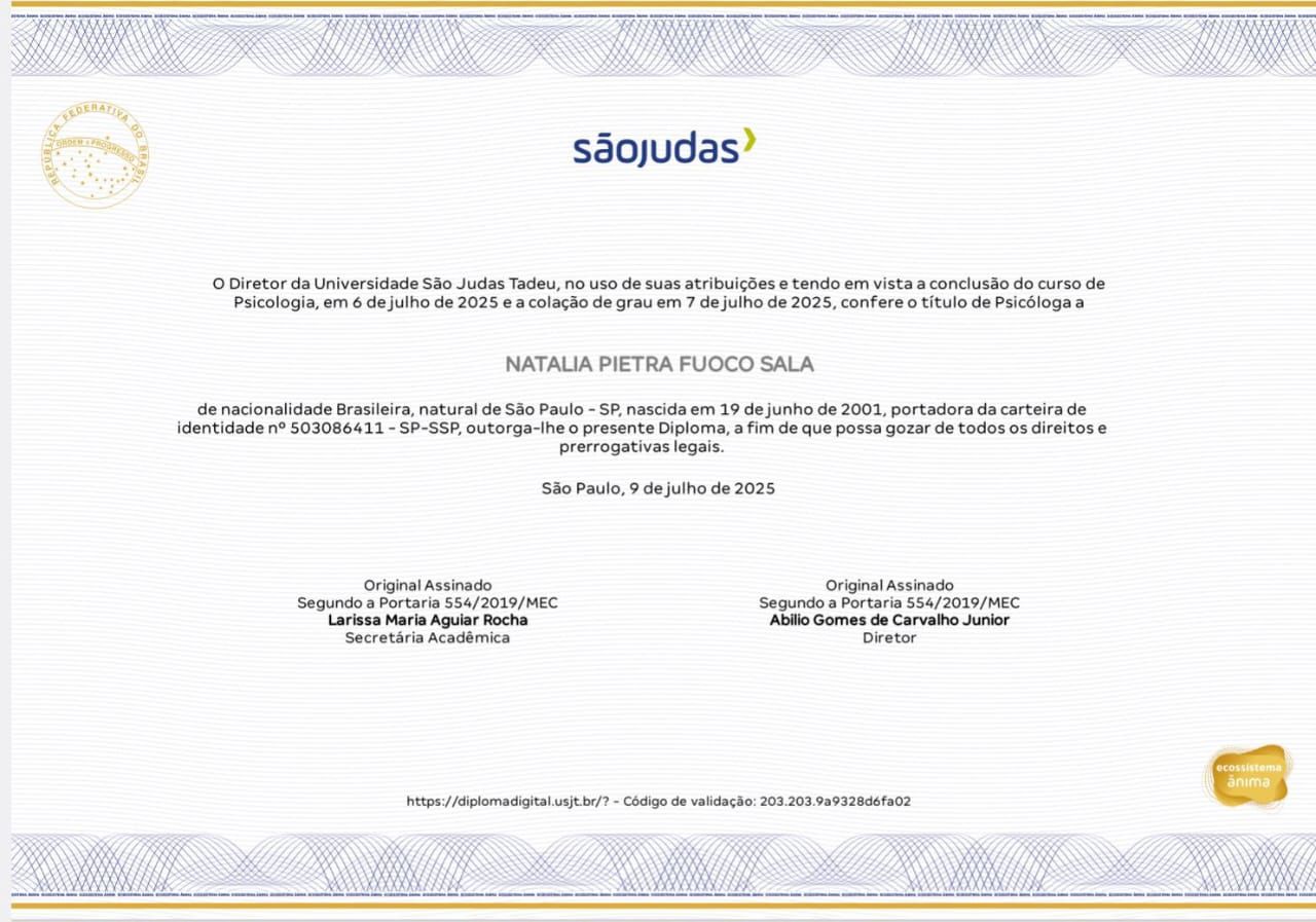 Sou uma profissional comunicativa, com escuta ativa, e estou em constante atualização: atualmente, sou pós-graduanda em Psicopatologias, o que amplia minha compreensão clínica e me permite oferecer um atendimento mais cuidadoso e fundamentado.