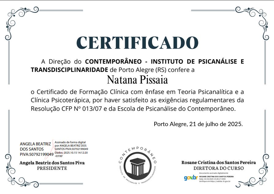 Sou psicóloga, especialista em Psicanálise e mestre em Educação. Atuo na área clínica e escolar, com atendimento a crianças, adolescentes e adultos. Minha prática é guiada pela ética da psicanálise, que valoriza a escuta singular e o respeito à subjetividade de cada pessoa.
