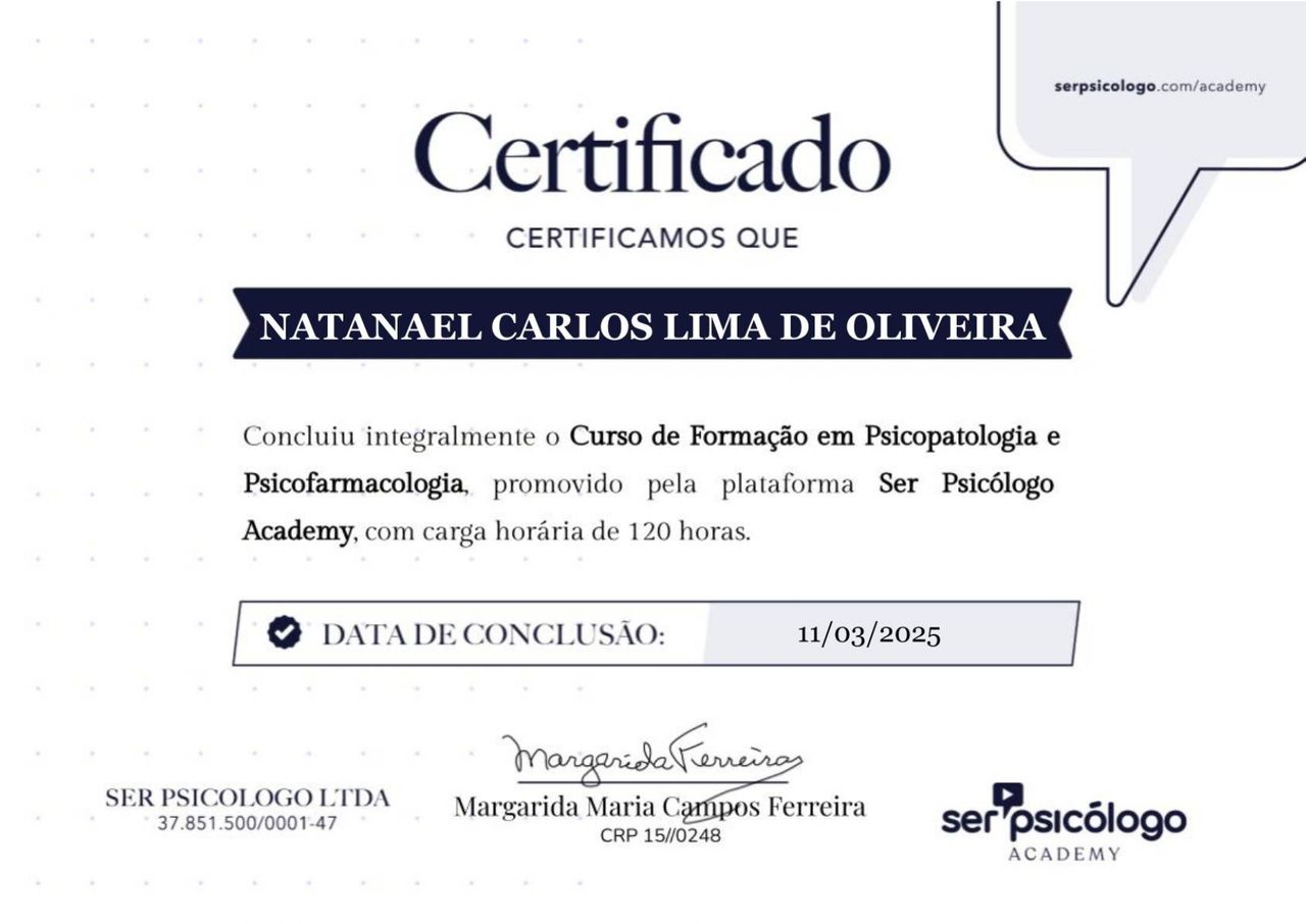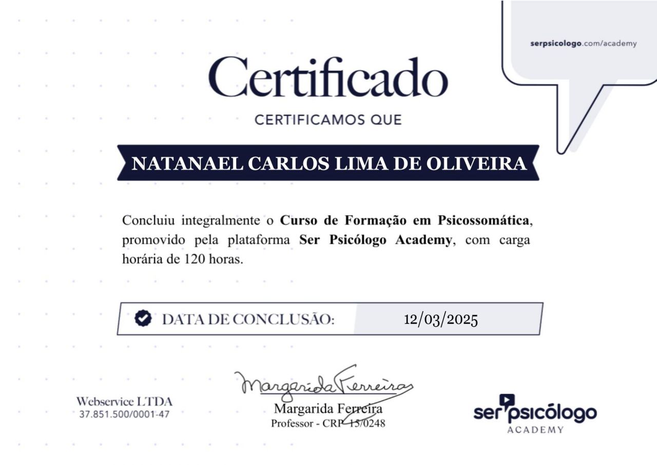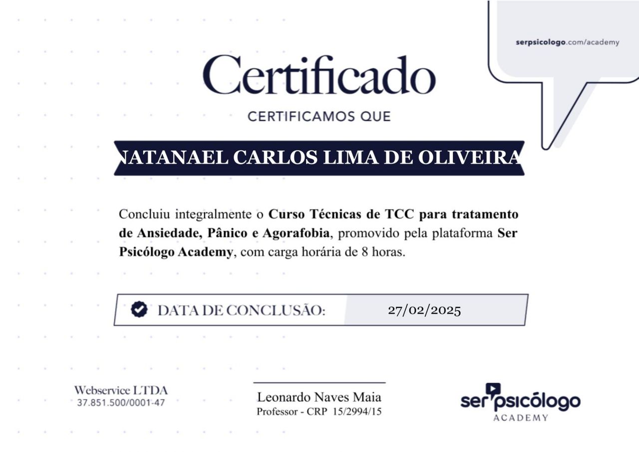 Quais são as principais especialidades de Natanael Carlos Lima?Natanael Carlos Lima é psicólogo. Te mostramos alguns dos serviços oferecidos pelo especialista graças à sua trajetória e vasta experiência: Acompanhamento a pacientes com: ansiedade,depressão, fobias e traumas psicológicos, Consulta Psicologia, Consulta psicológica do adolescente, Primeira consulta psicologia, Psicoterapia, Terapia Cognitivo Comportamental, Teleconsulta, Tratamento da ansiedade, Tratamento da depressão, Tratamento do luto.