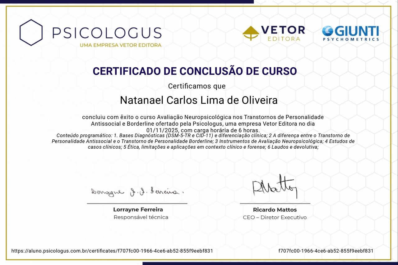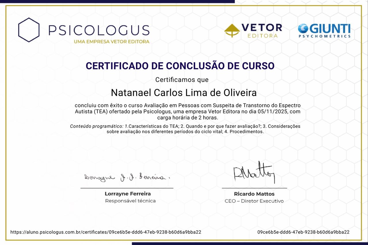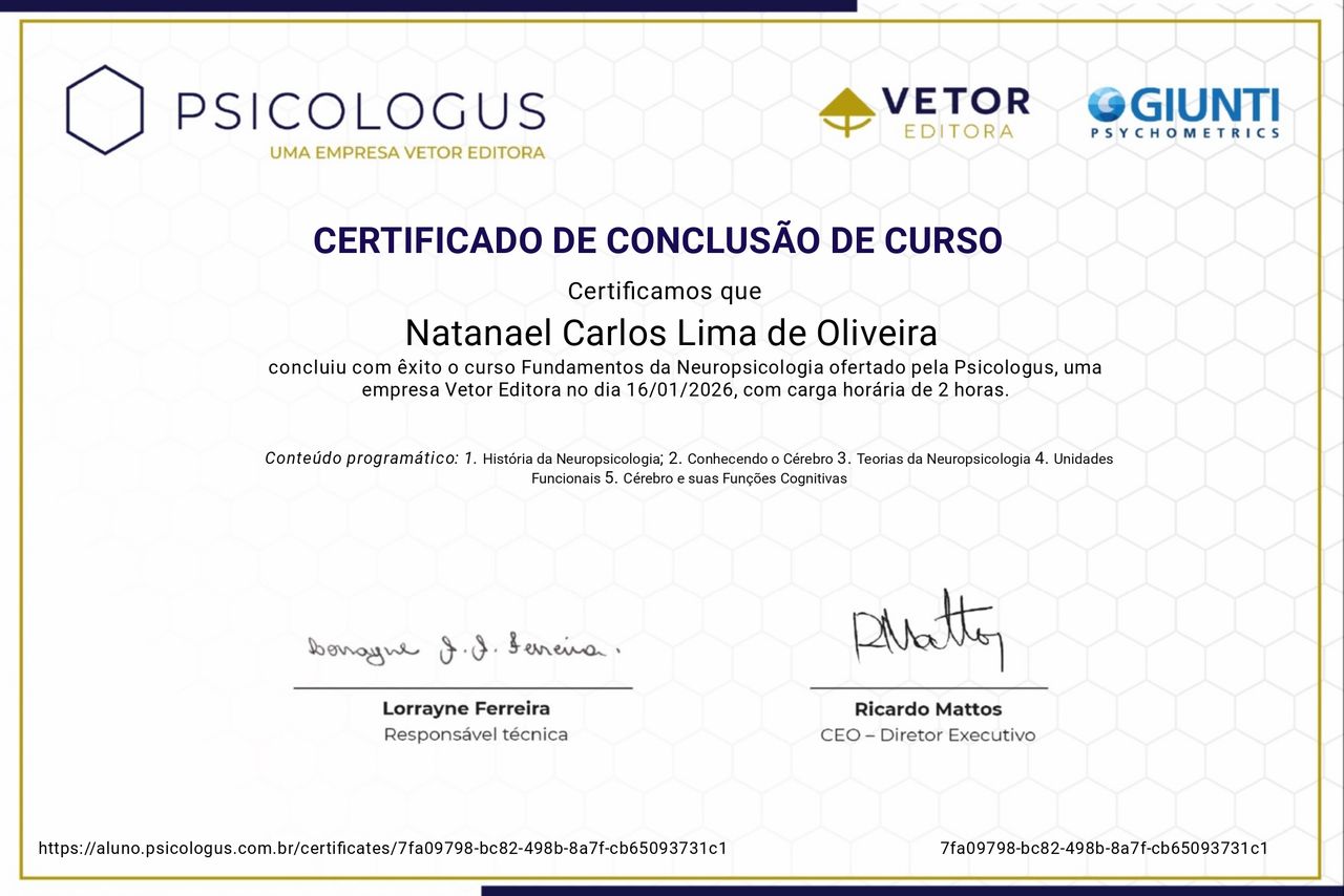 Psicólogo clínico com experiência em avaliação psicológica e acompanhamento psicoterapêutico de crianças, adolescentes e adultos. Atua com foco na promoção da saúde mental, manejo de transtornos emocionais e desenvolvimento de habilidades adaptativas, utilizando práticas baseadas em evidências e escuta qualificada. Possui experiência na aplicação de instrumentos psicológicos, elaboração de relatórios técnicos e condução de intervenções voltadas para ansiedade, depressão e dificuldades comportamentais. Comprometido com a ética profissional, acolhimento humanizado e melhoria contínua da qualidade de vida dos pacientes.