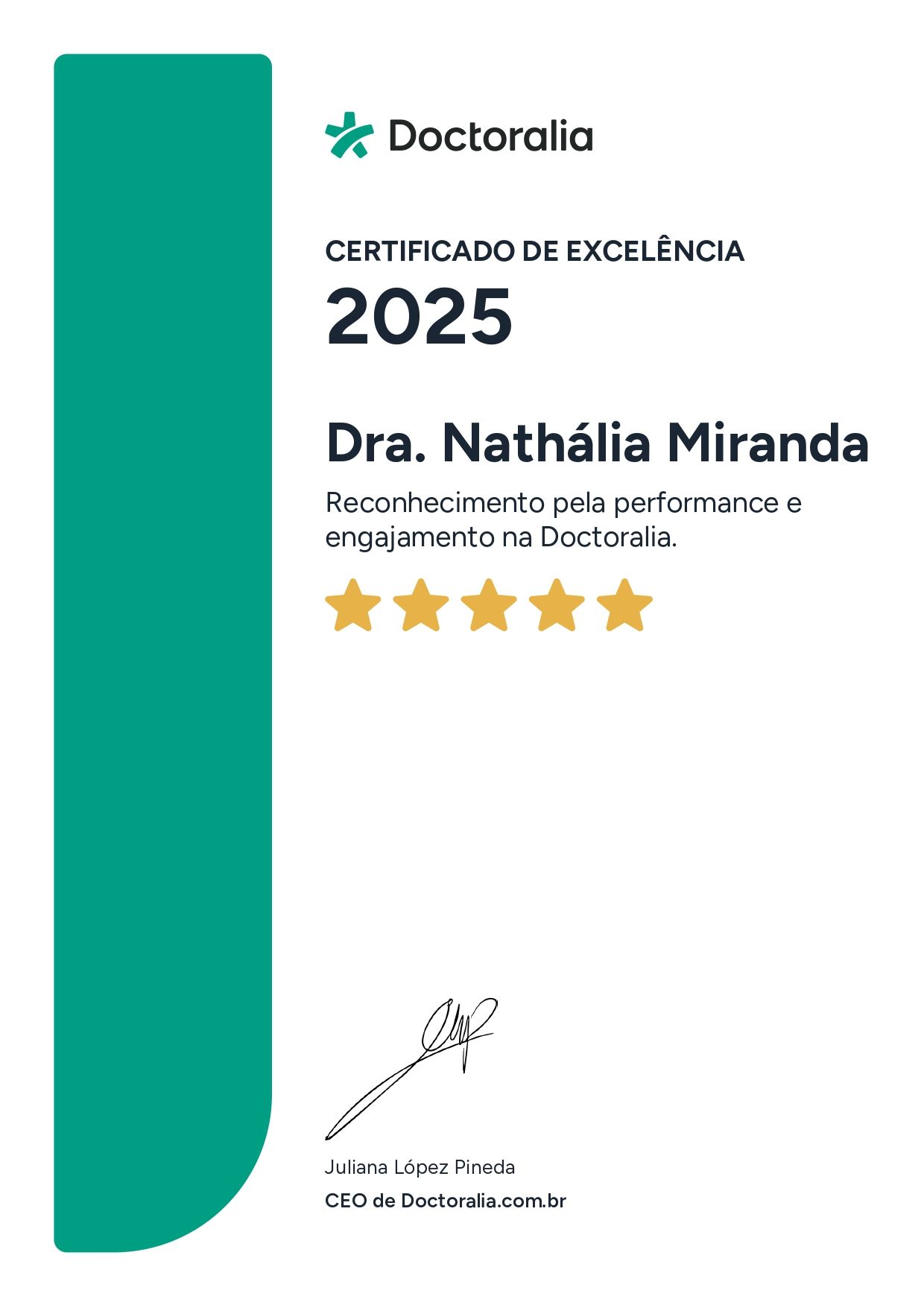 Como posso marcar uma consulta com Nathália Miranda?O calendário que Nathália Miranda exibe em seu perfil na Doctoralia é atualizado em tempo real. Tudo o que precisa é escolher o dia e a hora que forem mais convenientes para você. O agendamento é gratuito e você também recebe um lembrete antes da consulta.