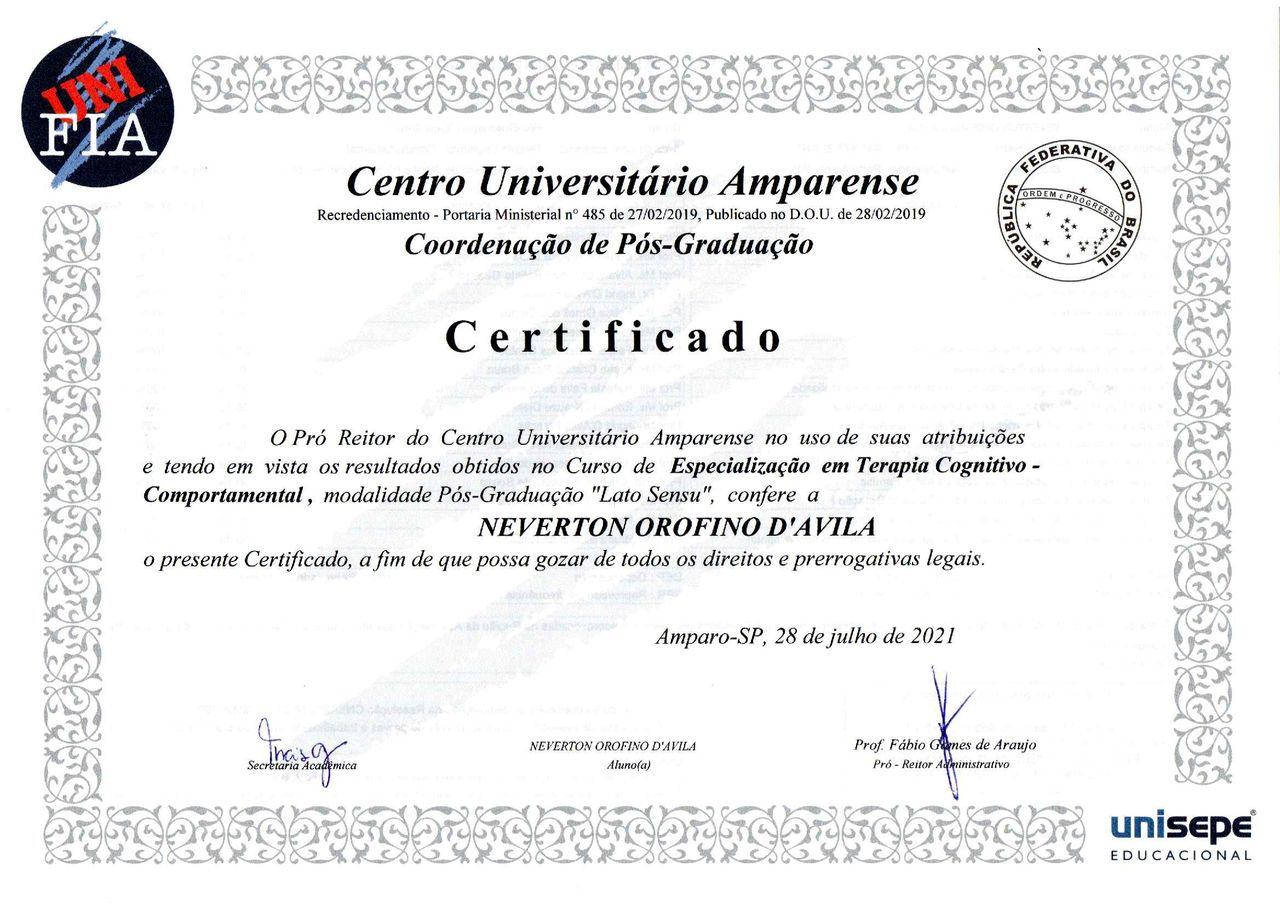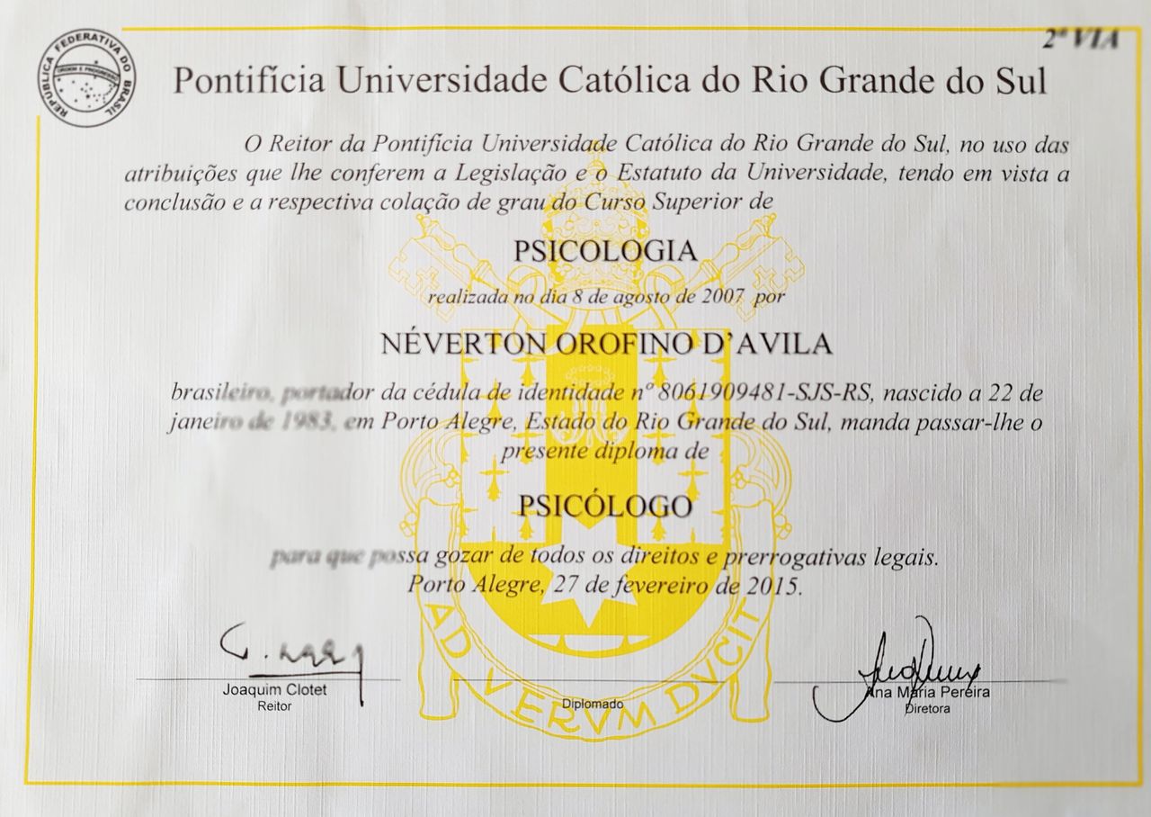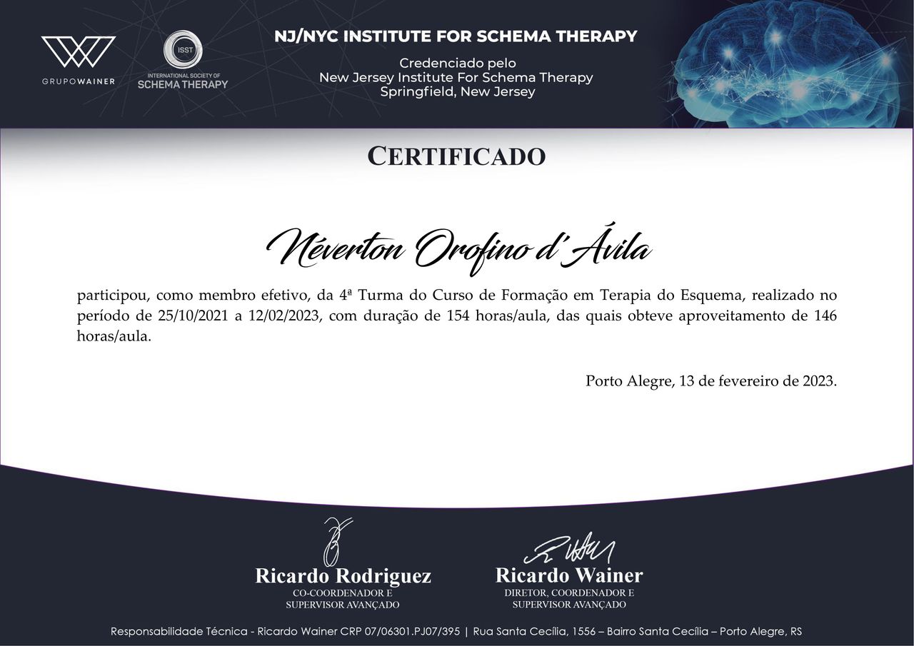 Sou o Néverton, psicólogo clínico, formado pela PUCRS desde 2007. Ao longo desses anos, venho me dedicando a estudar e me especializar para poder te oferecer um cuidado sério, acolhedor e baseado em evidências. Sou especialista em Terapia Cognitivo-Comportamental, Terapia do Esquema, Mestre em Saúde e Desenvolvimento Humano e Facilitador de Círculos de Construção de Paz.