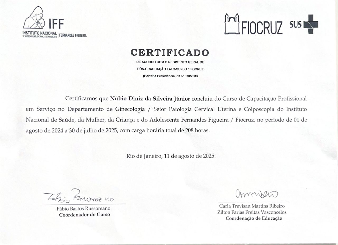 Quais são as principais especialidades de Nubio Diniz Silveira Junior?Nubio Diniz Silveira Junior é ginecologista. Te mostramos alguns dos serviços oferecidos pelo especialista graças à sua trajetória e vasta experiência: Retirada do DIU, Exame de Papanicolaou, Cauterização de verrugas do HPV, Análise e solicitação de exames, Tratamento da síndrome dos ovários policísticos, Reposição hormonal feminina, Consulta ginecologia, Check up, Reprodução assistida, Inserção do DIU hormonal.