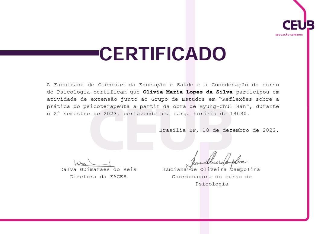 Olá! Sou uma psicóloga brasiliense formada pelo Centro Universitário de Brasília (CEUB). Sou psicoterapeuta orientada pela Gestalt-Terapia e acredito no poder da terapia como um espaço dialógico importante para a construção de novas possibilidades de existência.