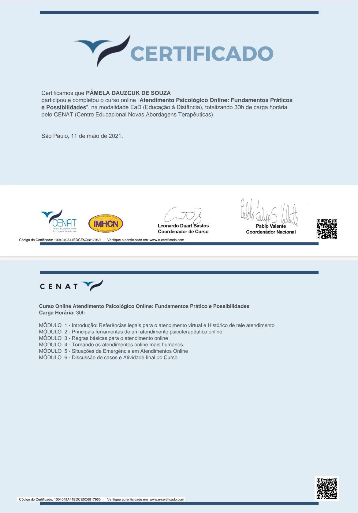 Posso passar por atendimento online com Pâmela Dauzcuk, sem ter que ir até o consultório?Sim, Pâmela Dauzcuk oferece atendimento online. Basta selecionar "Teleconsulta" ao agendar sua consulta e você poderá ver as datas e horários disponíveis.