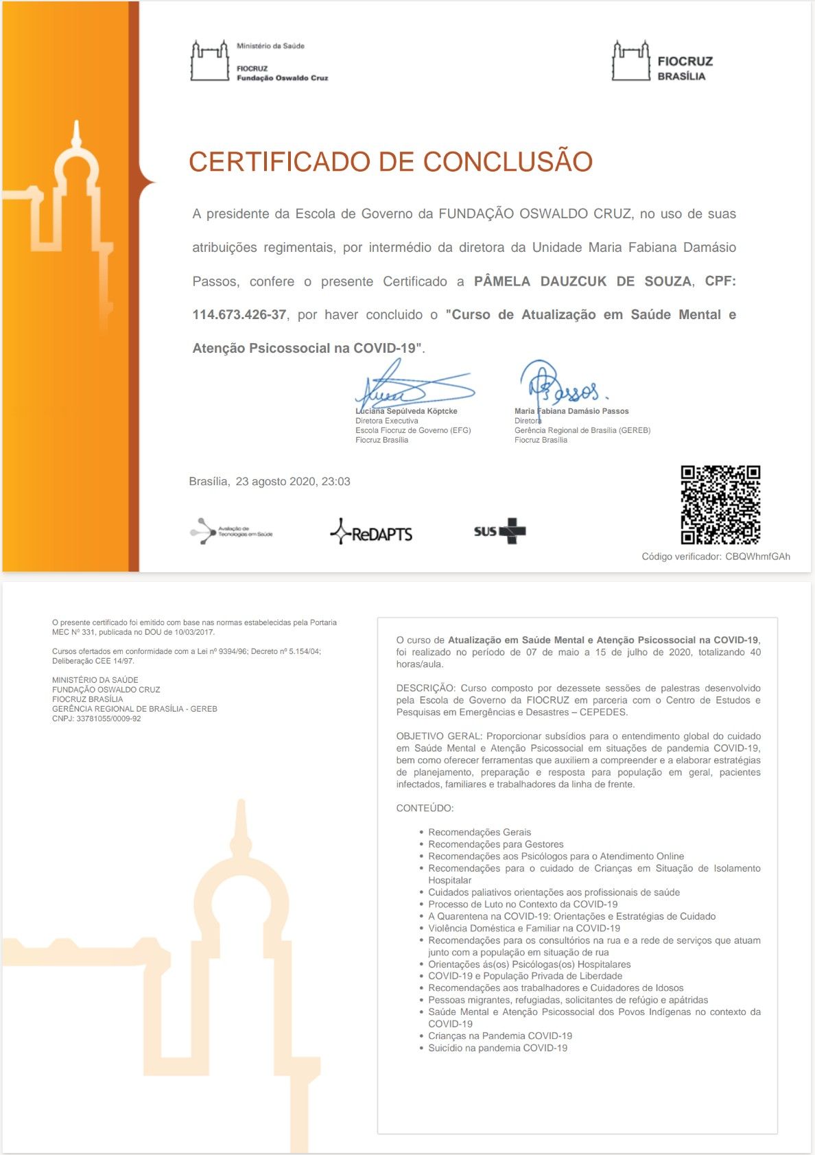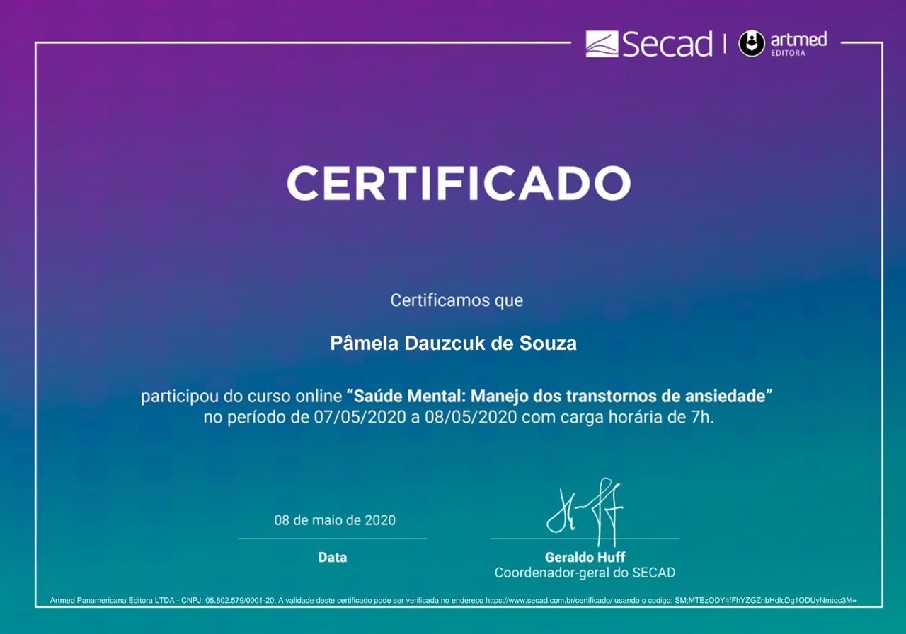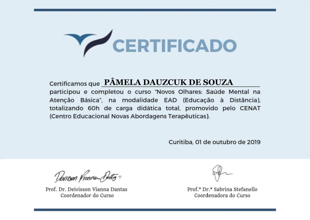 Quando poderia me consultar com Pâmela Dauzcuk?Pâmela Dauzcuk costuma ter horários disponíveis dentro da mesma semana ou para a semana seguinte. Verifique o calendário: você verá o primeiro horário disponível, atualizado em tempo real. Caso o horário sugerido não funcione para você, verifique outras datas. Agendar uma consulta é sempre imediato e gratuito.