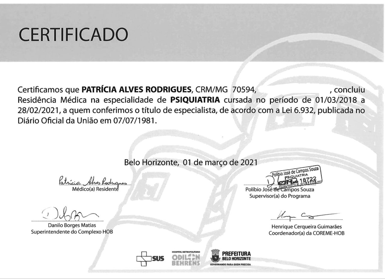 Quais são as principais especialidades de Patrícia Alves Rodrigues?Patrícia Alves Rodrigues é psiquiatra. Te mostramos alguns dos serviços oferecidos pelo especialista graças à sua trajetória e vasta experiência: Primeira consulta Psiquiatria, Consulta Psiquiatria, Acompanhamento de transtorno do espectro autista (TEA), Acompanhamento de pacientes adultos, Tratamento para transtorno de ansiedade, Tratamento para Depressão, Transtorno de déficit de atenção e hiperatividade - TDAH, Consulta psiquiátrica especializada na associação entre transtornos psiquiátricos gerais e o uso de substâncias químicas.