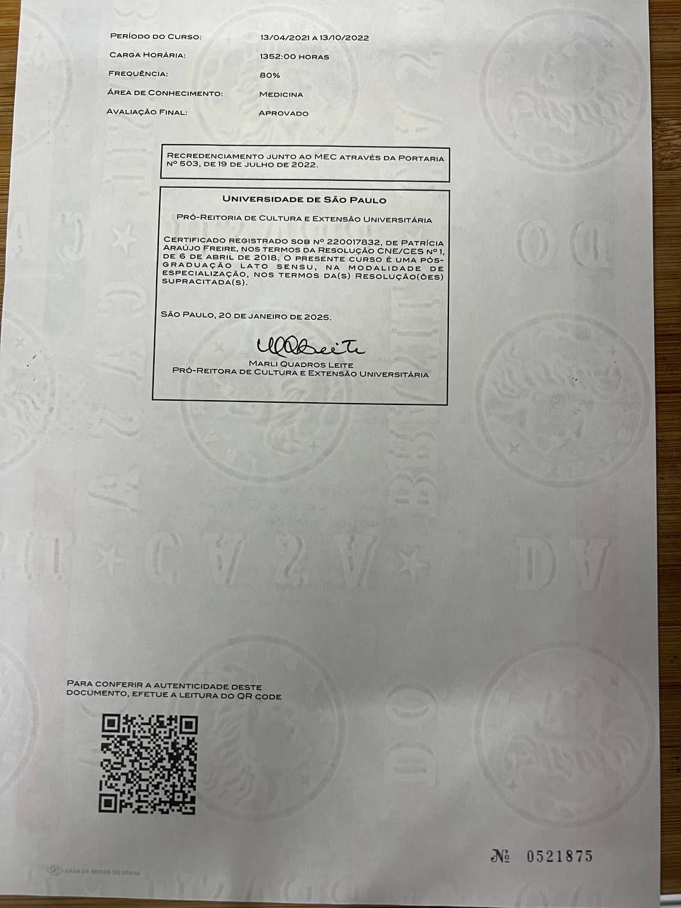 Posso passar por atendimento online com Patricia Araujo Freire, sem ter que ir até o consultório?Sim, Patricia Araujo Freire oferece atendimento online. Basta selecionar "Teleconsulta" ao agendar sua consulta e você poderá ver as datas e horários disponíveis.