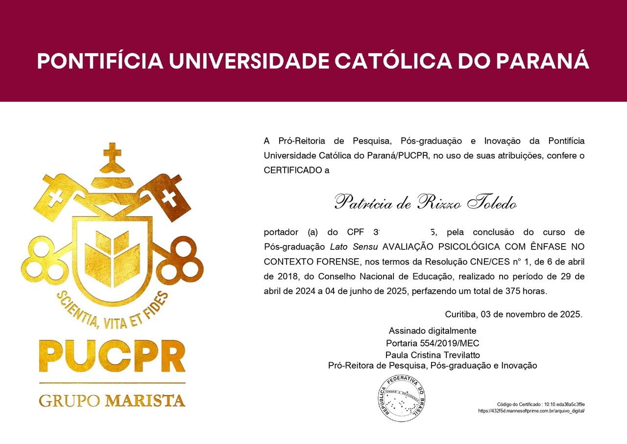 Sou formada em Psicologia pela UNESP, em 2014, e em Filosofia pela PUC, em 2021. Possuo especializações em Psicologia Jurídica e em Avaliação Psicológica. Tenho experiência em psicologia jurídica, com atuação em Tribunal de Justiça.
