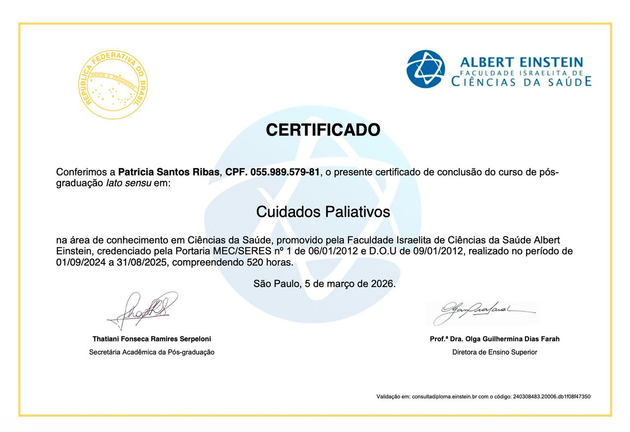 Sou Dra. Patrícia Ribas, Médica de Família e Comunidade, com formação em Cuidados Paliativos e Geriatria e atuação voltada ao cuidado integral da pessoa em todas as fases da vida e com experiência em atenção primária à saúde e envelhecimento saudável.