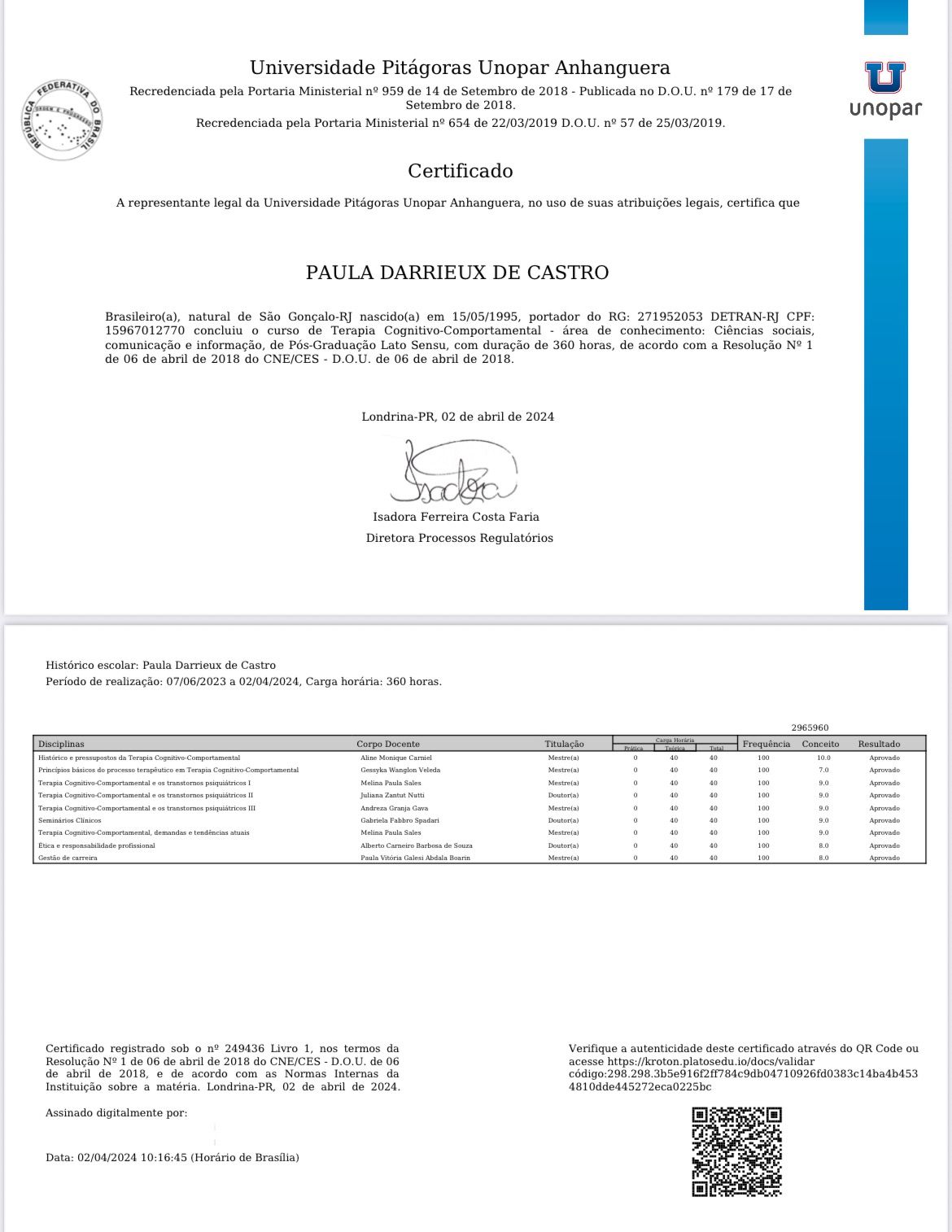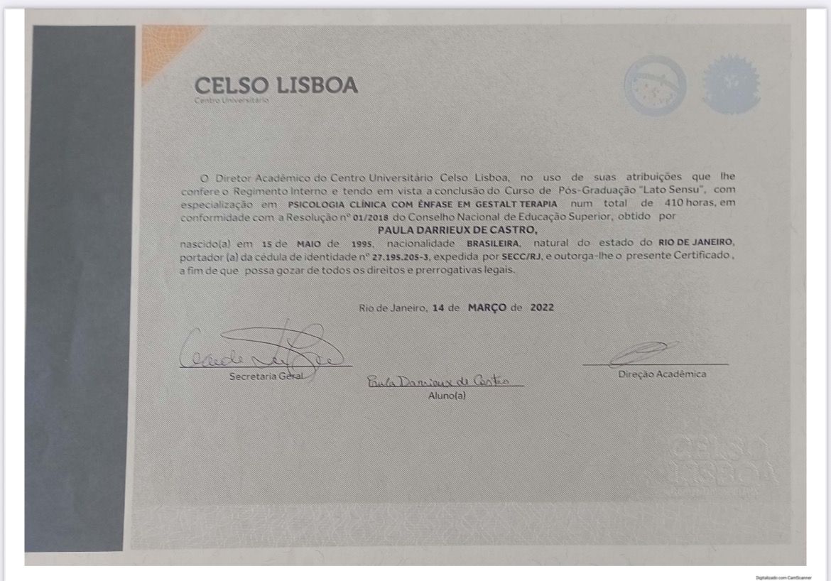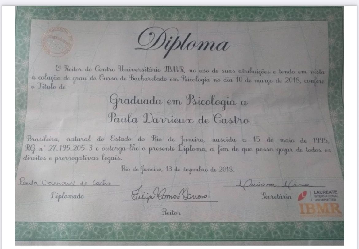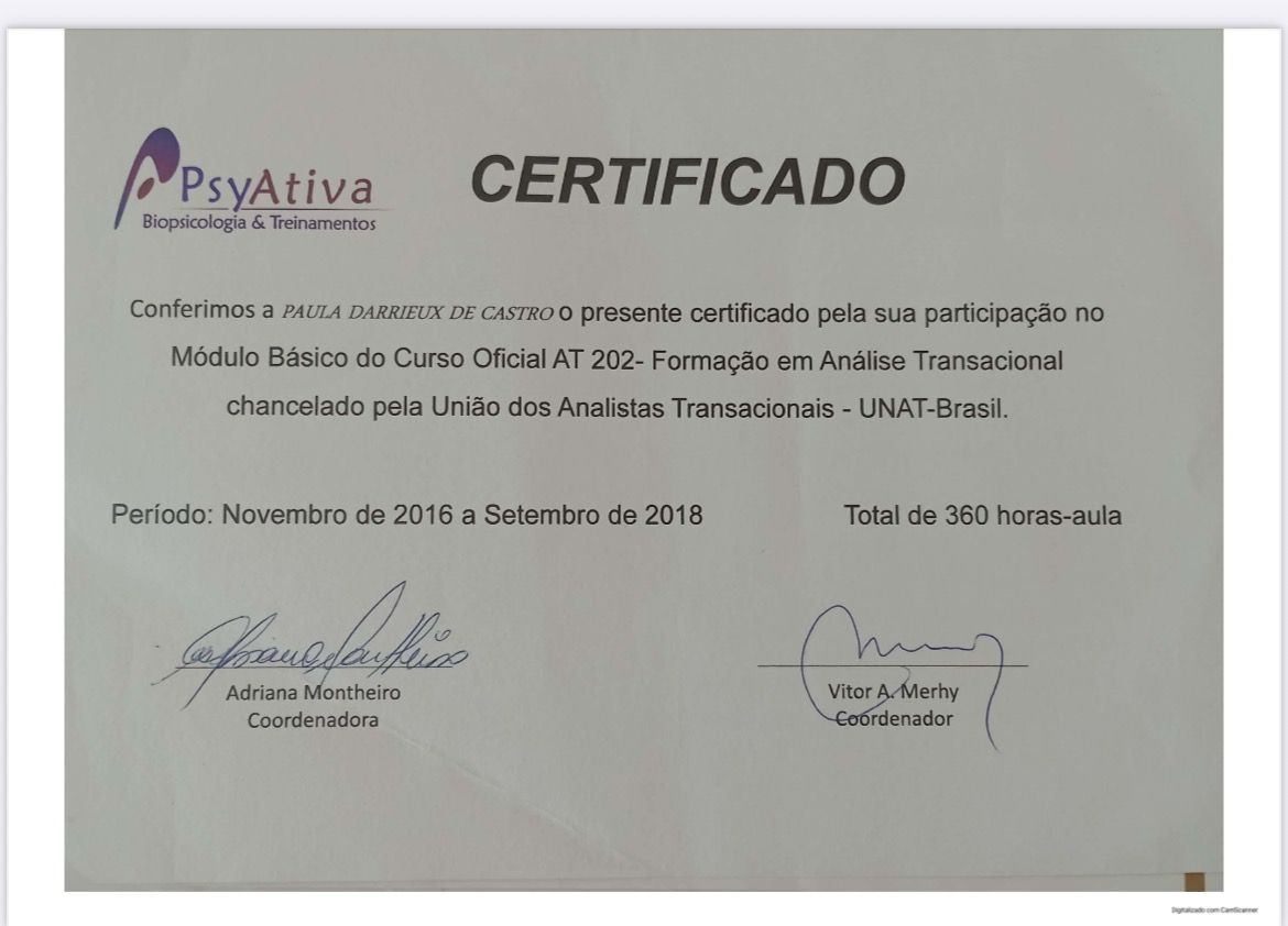Além disso, possui algumas formações extras como Análise Transacional, Gestalt Terapia, Terapia do Esquema, Terapia Dialética Comportamental e entre outras.