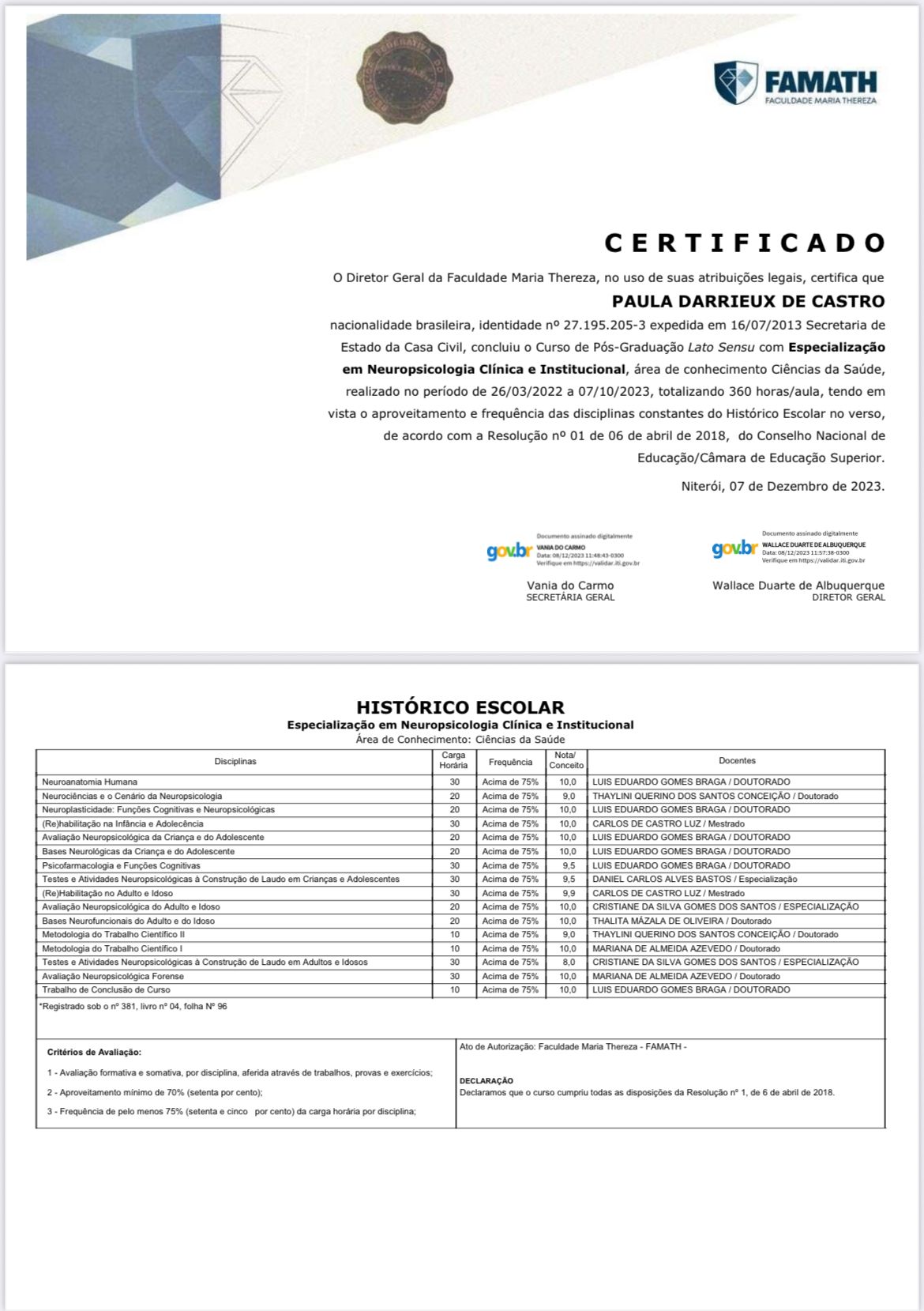 Sou especialista em Neuropsicologia Clínica (FAMATH) e em Terapia Cognitivo Comportamental (ANHANGUERA)