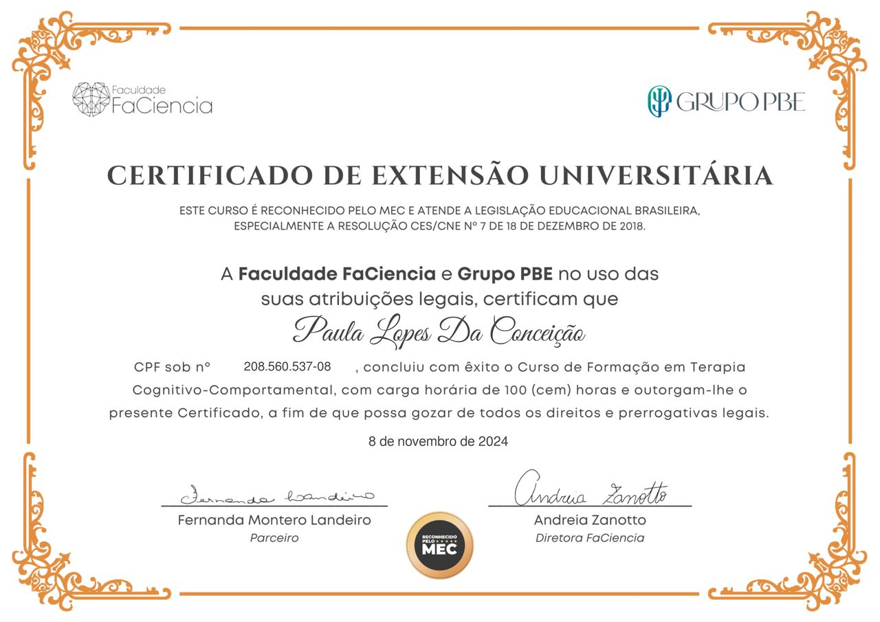 Olá! Tenho atualmente 22 anos, me consultei com a Paula durante um período muito difícil da minha vida. Ela me ajudou a superar os desafios, entender que nem tudo está nas minhas mãos e a me enxergar com muito carinho. Aconselho a qualquer pessoa a se consultar com ela pois vale muito a pena!