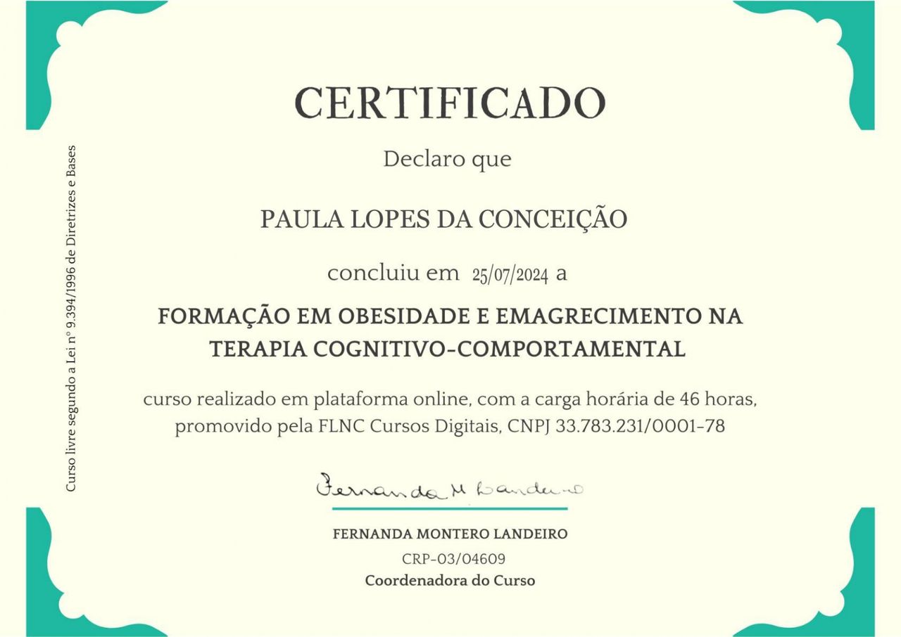 Sou psicóloga com formação em Terapia Cognitivo-Comportamental e em Obesidade e Emagrecimento. Estou me especializando em Neurociência e Comportamento pela PUC-RS. Atendo adolescentes a partir de 13 anos e mulheres adultas. Eu vou te auxiliar em questões como depressão, autoestima, regulação emocional, ansiedade e outros desafios do seu dia a dia. O meu objetivo é te proporcionar um ambiente de acolhimento e orientação para que você possa se conhecer melhor e construir uma vida saudável e de acordo com o que faz sentido para você.