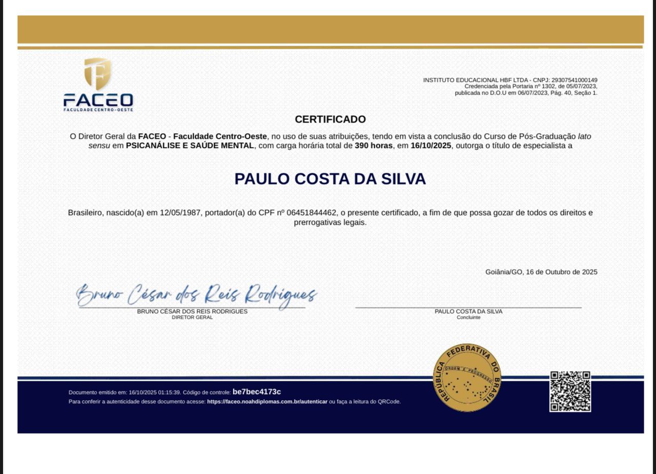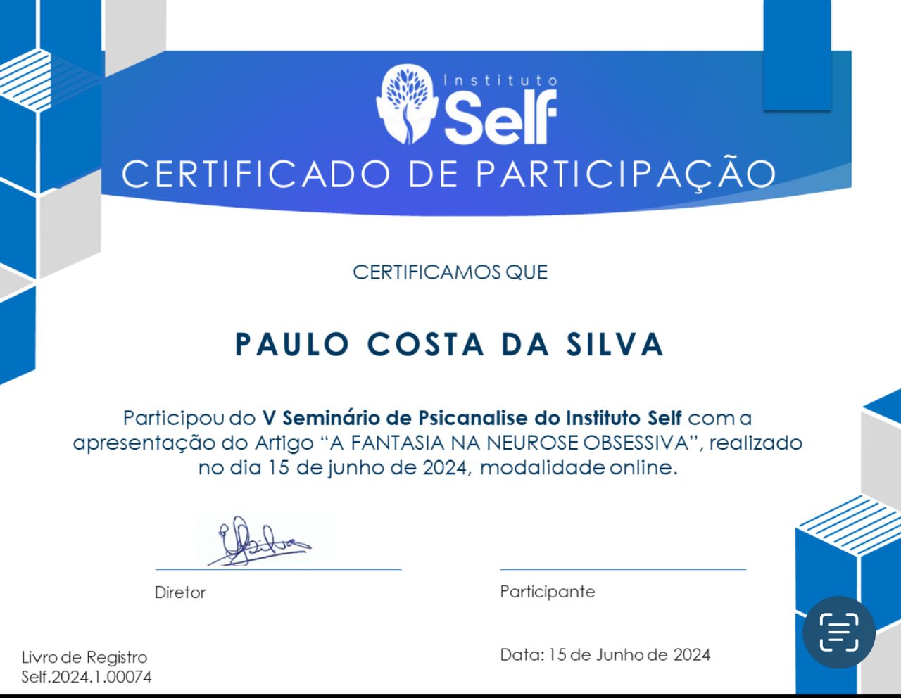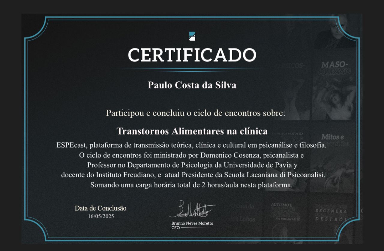 Tenho diversos cursos realizados no instituto ESPE de psicanálise.