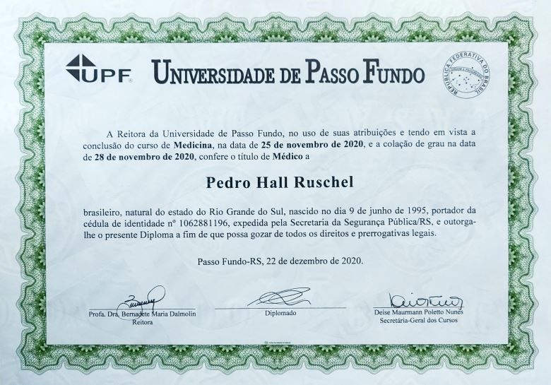 Médico formado pela Faculdade de Medicina da Universidade de Passo Fundo em 2020/2. Atuou como Médico no combate a COVID-19 no município de Passo Fundo/RS no período de 12/2020 a 01/2021. Médico militar, atuando também como médico auditor, à serviço do Exército Brasileiro pelo Comando da Artilharia Divisionária da 3ª Divisão de Exército - AD3 em Passo Fundo-RS e Cruz Alta-RS de 02/2021 a 01/2022. Residente de Neurologia do Complexo Hospitalar Santa Casa de Misericórdia de Porto Alegre/UFCSPA iniciado em 03/2022. Como acadêmico foi presidente da Liga Acadêmica de Neurocirurgia do Hospital de Clínicas de Passo Fundo e membro efetivo da Liga Acadêmica de Medicina Legal da Universidade de Passo Fundo. Foi monitor da disciplina de Anatomia Humana. Fez estágio extracurricular em Serviço de Cirurgia Geral e em Neurologia e Neurocirurgia no Hospital da Cidade de Passo Fundo; em Gastroenterologia e Hepatologia no Hospital São Vicente de Paulo de Passo Fundo; e em Neurocirurgia no Hospital Cristo Redentor de Porto Alegre. Foi pesquisador em atividades de iniciação científica na Universidade de Passo Fundo 2016-2018. Integrou como acadêmico a Ação Estratégica 'O BRASIL CONTA COMIGO' do Ministério da Saúde em 2020.