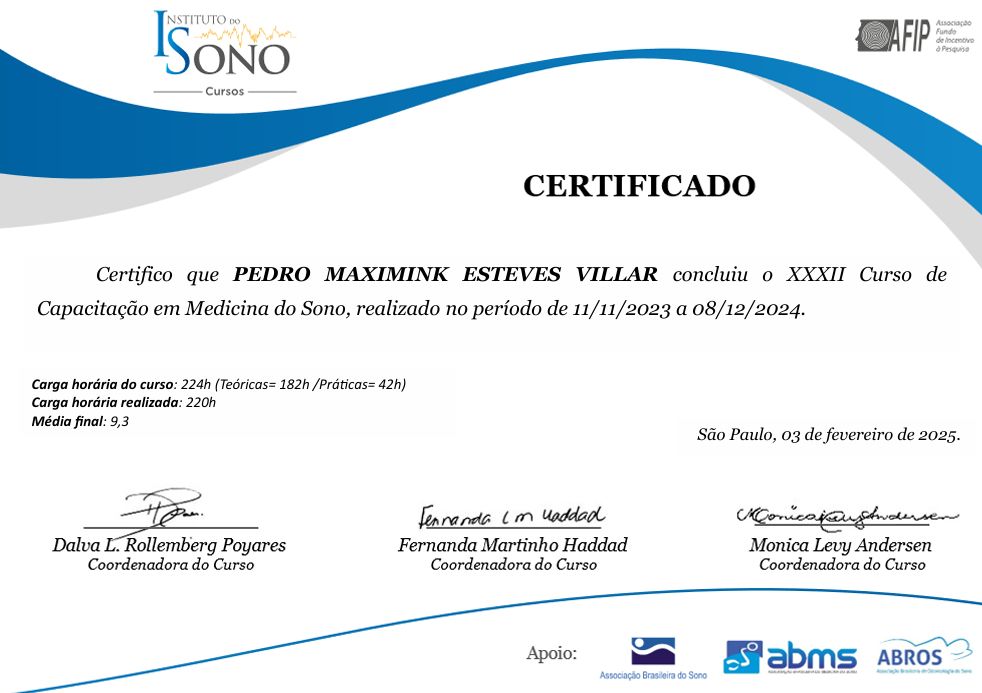 Conclui o curso de Capacitação em Medicina do Sono pelo Instituto do Sono – SP (2023-2024).