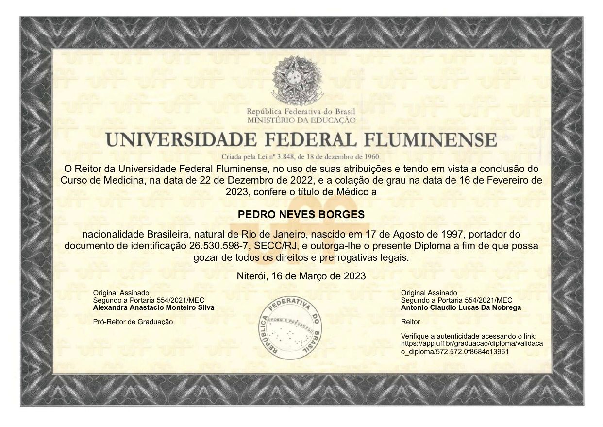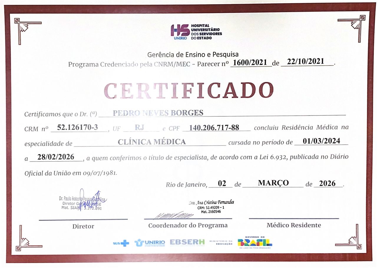 Sou formado pela Universidade Federal Fluminense (UFF) em 2022. Realizei minha residência em Clínica Médica no Hospital Federal dos Servidores do Estado, atualmente chamado Hospital Universitário Servidores do Estado (UNIRIO). Também estou iniciando uma residência médica adicional em Clínica Médica no Hospital Universitário Clementino Fraga Filho da Universidade Federal do Rio de Janeiro (UFRJ).