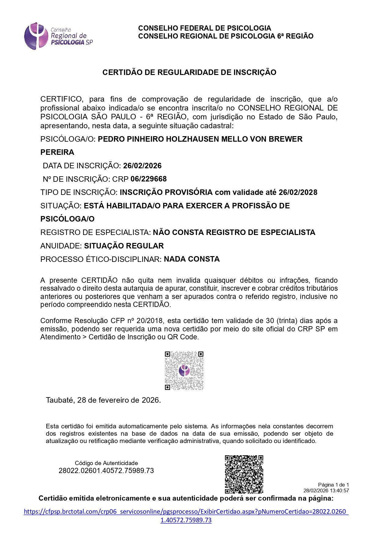 Número de registro: CRP SP 229668