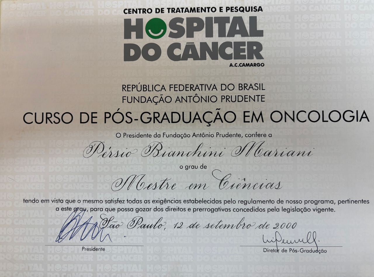 Terminando a residência entrei no mestrado no Hospital A C Camargo e após finalizar o tempo de mestrado iniciei a segunda Universidade na Universidade Cidade de São Paulo aqui em São Paulo.