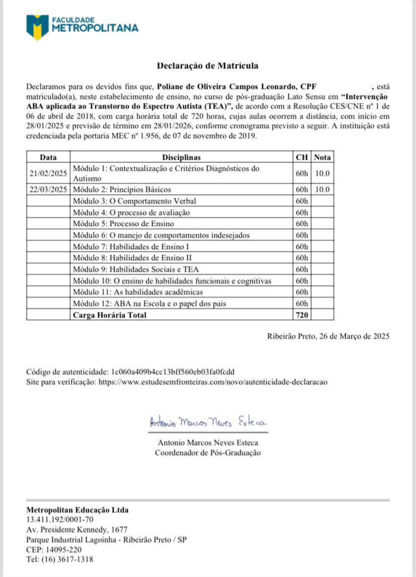 •Pós-graduanda Intervenção ABA Aplicada ao Transtorno do Espectro Autista