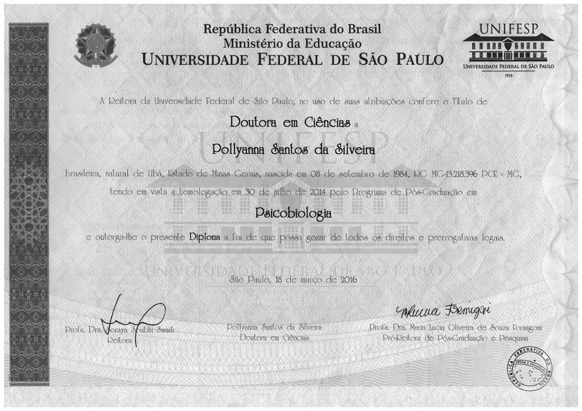 Sou psicóloga e mestre em Psicologia pela UFJF (2007-2010), além de doutora em Psicobiologia pela UNIFESP (2014).