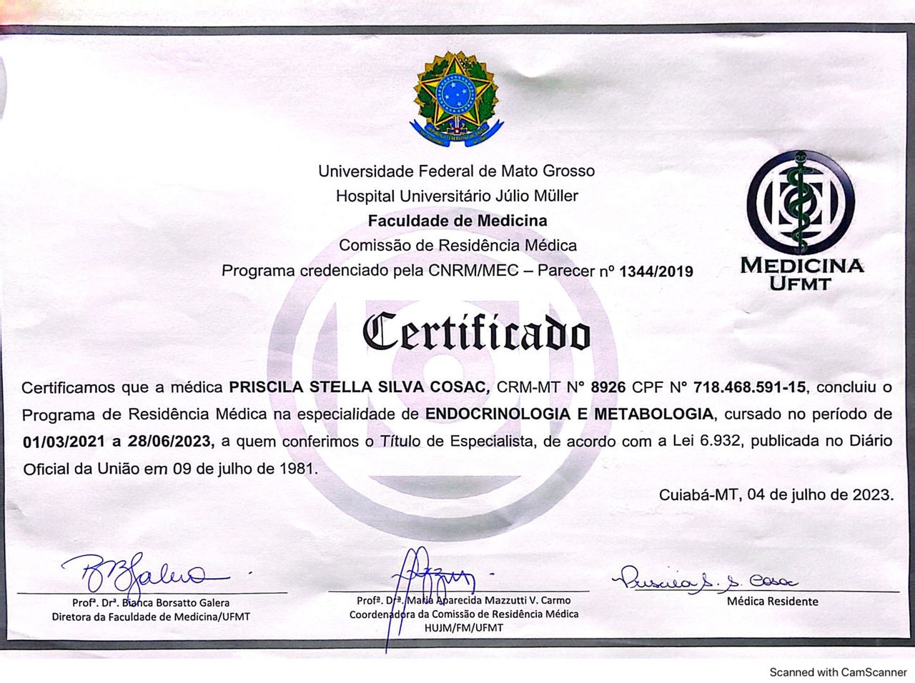 • Residência em Endocrinologia e Metabologia pelo Hospital Universitário Júlio Müller (HUJM/UFMT)