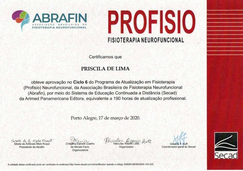 Quais são as principais especialidades de Priscila de Lima?Priscila de Lima é fisioterapeuta. Te mostramos alguns dos serviços oferecidos pelo especialista graças à sua trajetória e vasta experiência: Primeira consulta Fisioterapia, Consulta Fisioterapia, Fisioterapia intensiva, Avaliação fisioterapêutica.