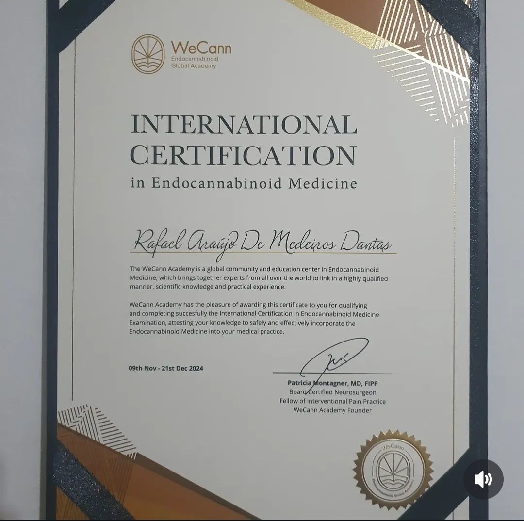 Certificado em medicina canabinoide pela Wecann Academy e pela Vigo Academy. Pós graduando em medicina canabinoide pela Conaes Brasil.