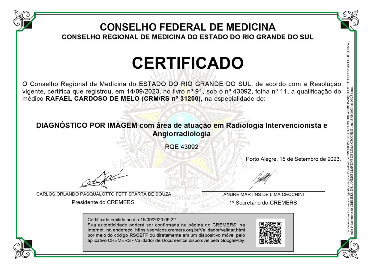 Sou médico graduado pela UFPR em 2006. Fiz residência em Clínica Médica na UFCSPA em 2007/2008 e Radiologia e Diagnóstico por Imagem em 2009/2010/2011. Scholarship em Imagem Oncológica pela ESOR no Guy´s and St. Thomas´ Hospital em Londres-UK (2011). Curso de Aperfeiçoamento em PET-CT no CDPI, Rio de Janeiro-RJ em 2012. Fellowship de Radiologia Abdominal, Intervenção percutânea e Radiologia Intervencionista Vascular e não Vascular na Universidade McGill do Canadá em 2019 e 2020. Atuei como Radiologista Intervencionista na Santa Casa de Misericórdia de Porto Alegre de 2012 a 2024 e atuo na Rede de Saúde Divina Providência como responsável pelo serviço de Radiologia e Diagnóstico por Imagem desde 2014. Atuo como Radiologista Intervencionista nos Hospitais Humaniza e Divina. Sou membro titular da Sociedade Brasileira de Radiologia Intervencionista e Cirurgia Endovascular (SOBRICE) desde 2023.
