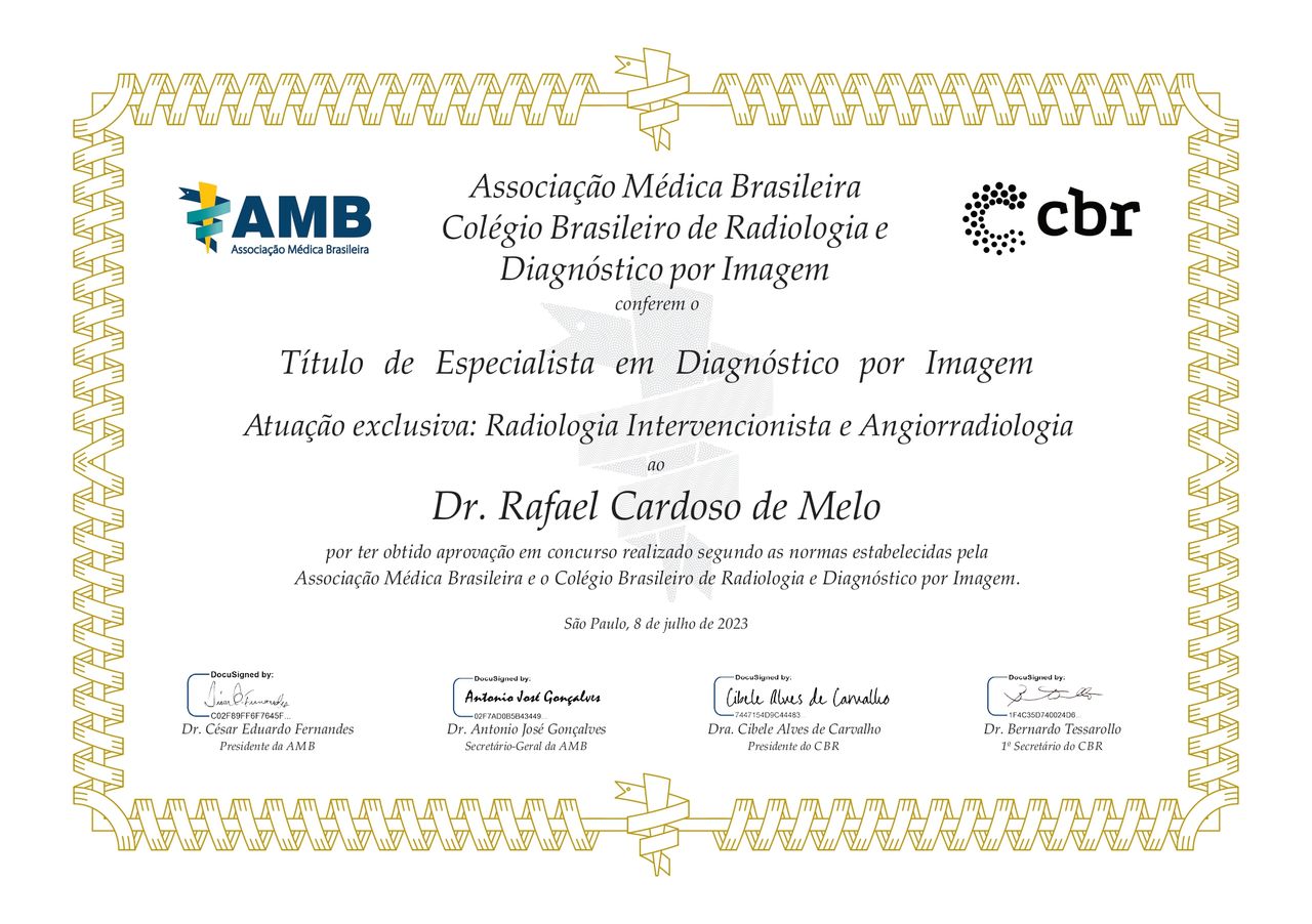Quais são as principais especialidades de Rafael Cardoso de Melo?Rafael Cardoso de Melo é radiologista, especialista em diagnóstico por imagem. Te mostramos alguns dos serviços oferecidos pelo especialista graças à sua trajetória e vasta experiência: Ultrassonografia durante a gravidez, Doppler colorido de carótidas e vertebrais, Teleconsulta, Biopsia Da Prostata, Encaixe Telemedicina, Eco Doppler, Angioplastia intraluminal de vasos viscerais ou renais, Ultrassonografia, Ultrassonografia pélvica, Colocação percutânea de filtro de veia cava na trombose venosa.