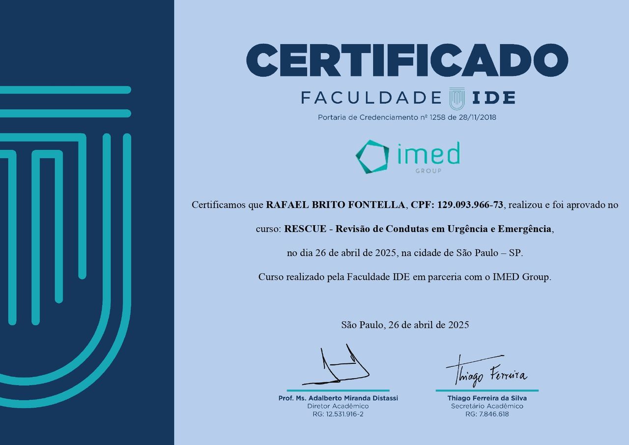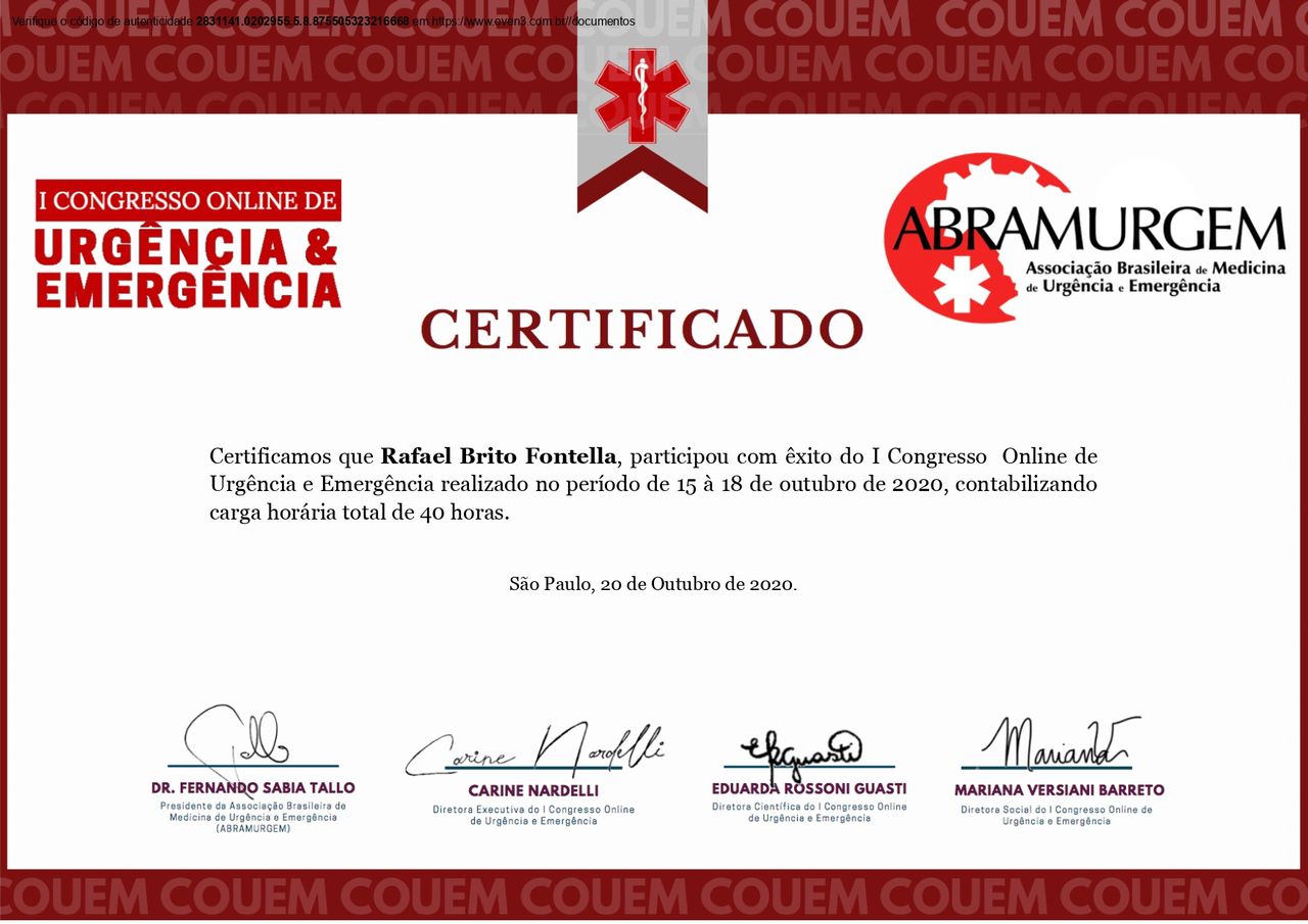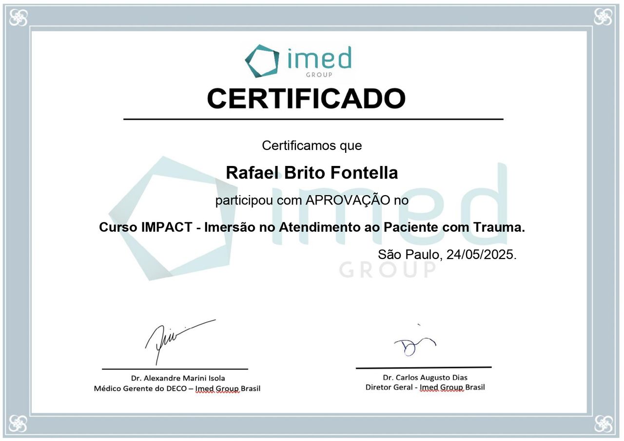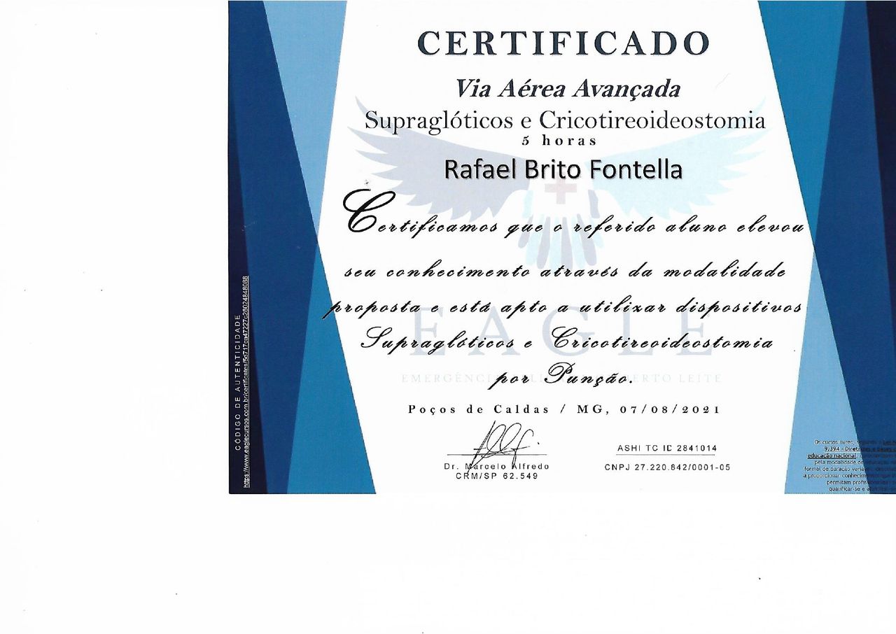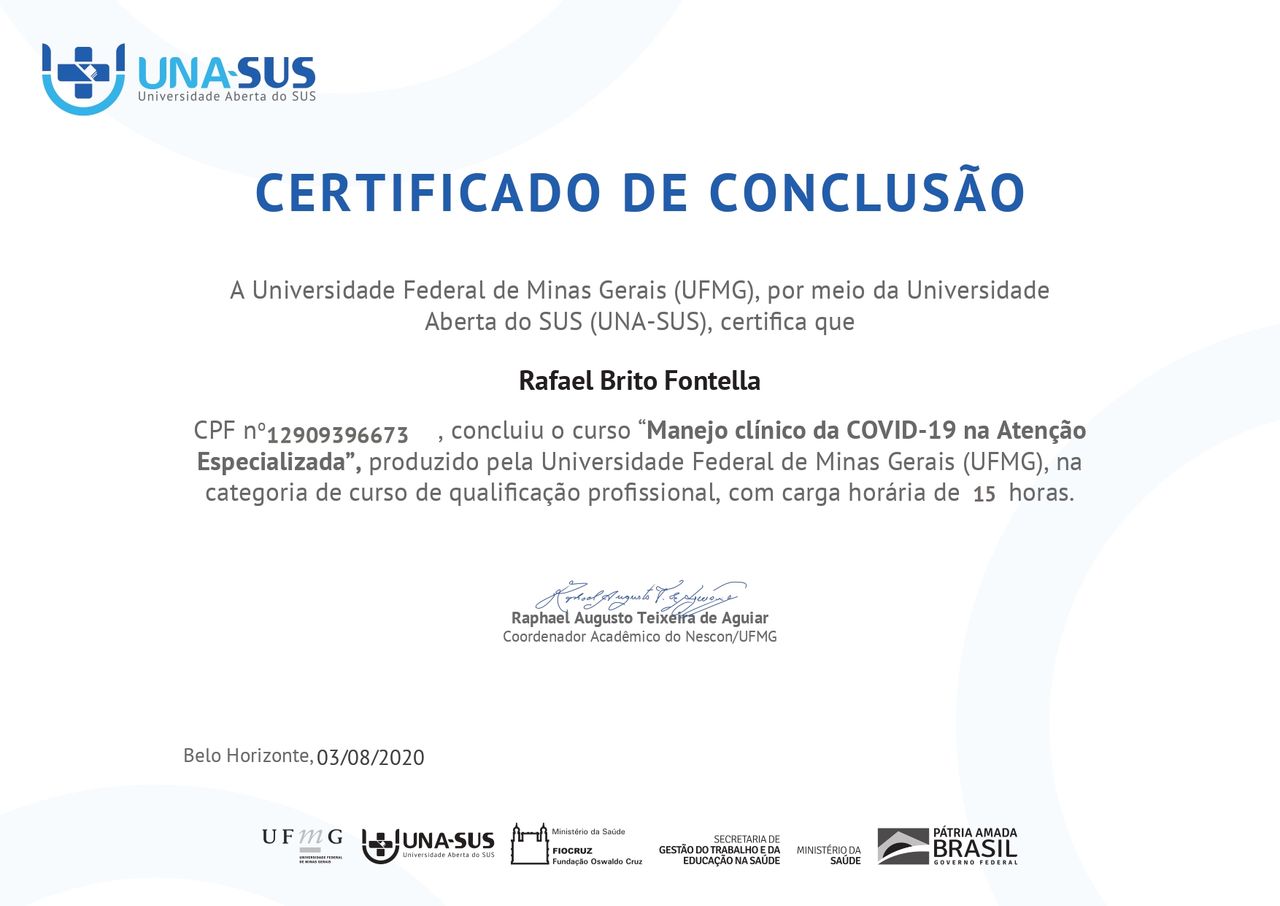 PALS - Suporte Avançado de Vida em Pediatria, HAPTUS - Curso de Habilidades Práticas no Treinamento de Ultrassonografia, IMPACT - Imersão no Atendimento ao Paciente com Trauma, RESCUE - Revisão de Condutas em Urgência e Emergência, ACEVE - Acesso Vascular Ecoguiado, ACLS - Suporte Avançado de Vida Cardiovascular, Via Aérea Avançada - Supraglóticos e Cricotireoideostomia, MAPS - Interligas Internacional (Medicina Aplicada na Prática de Esportes) UNIFESP/ Dr. Paulo Cavalcante Muzy, Manejo de Antibióticos, Manejo clínico da COVID-19 na Atenção Especializada, Orientações gerais ao paciente com COVID-19 na Atenção Primária à Saúde, Síndrome Gripal e COVID-19 / Instituto Sírio-Libanês de Ensino e Pesquisa, Introdução à Ventilação Mecânica / Instituto Sírio-Libanês de Ensino e Pesquisa.