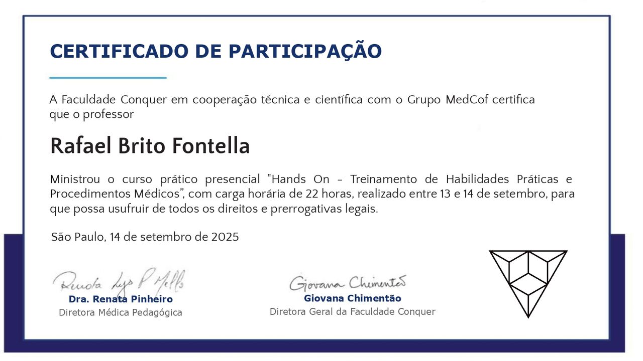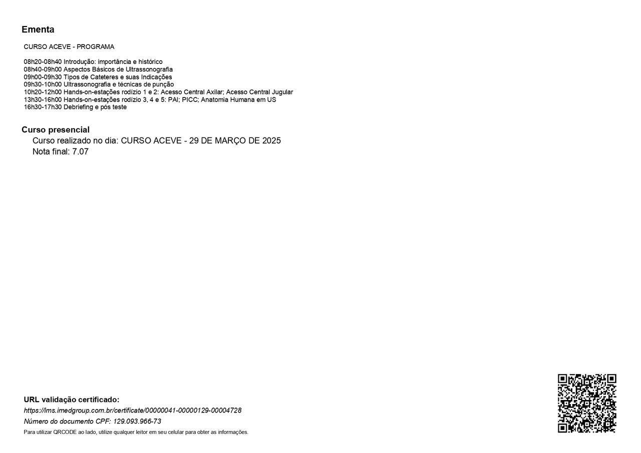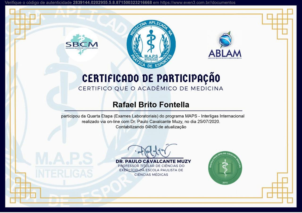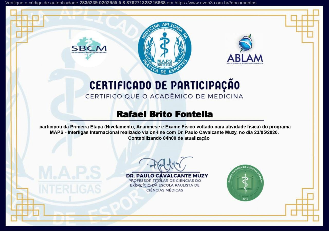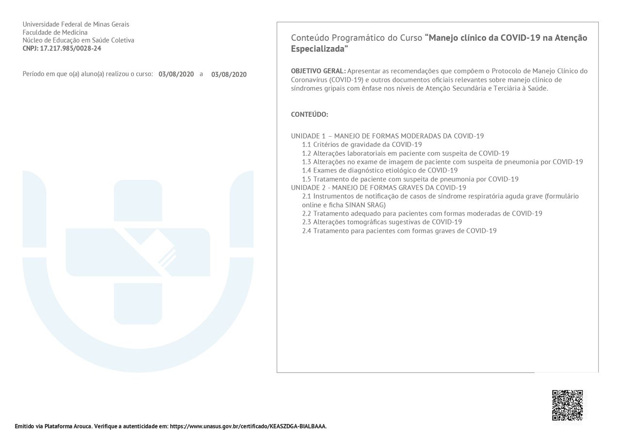 PALS - Suporte Avançado de Vida em Pediatria, HAPTUS - Curso de Habilidades Práticas no Treinamento de Ultrassonografia, IMPACT - Imersão no Atendimento ao Paciente com Trauma, RESCUE - Revisão de Condutas em Urgência e Emergência, ACEVE - Acesso Vascular Ecoguiado, ACLS - Suporte Avançado de Vida Cardiovascular, Via Aérea Avançada - Supraglóticos e Cricotireoideostomia, MAPS - Interligas Internacional (Medicina Aplicada na Prática de Esportes) UNIFESP/ Dr. Paulo Cavalcante Muzy, Manejo de Antibióticos, Manejo clínico da COVID-19 na Atenção Especializada, Orientações gerais ao paciente com COVID-19 na Atenção Primária à Saúde, Síndrome Gripal e COVID-19 / Instituto Sírio-Libanês de Ensino e Pesquisa, Introdução à Ventilação Mecânica / Instituto Sírio-Libanês de Ensino e Pesquisa.