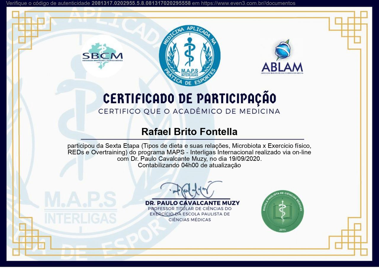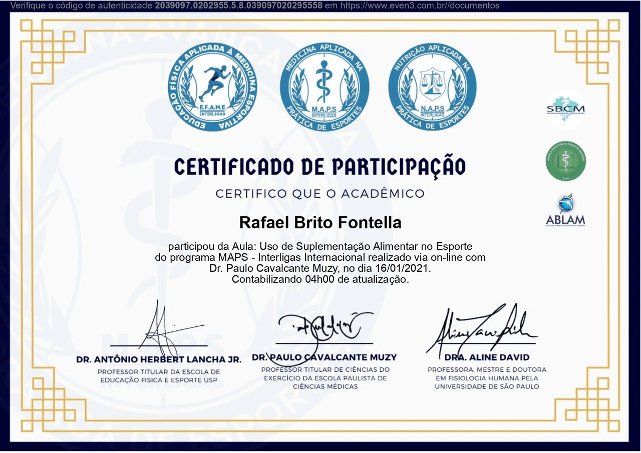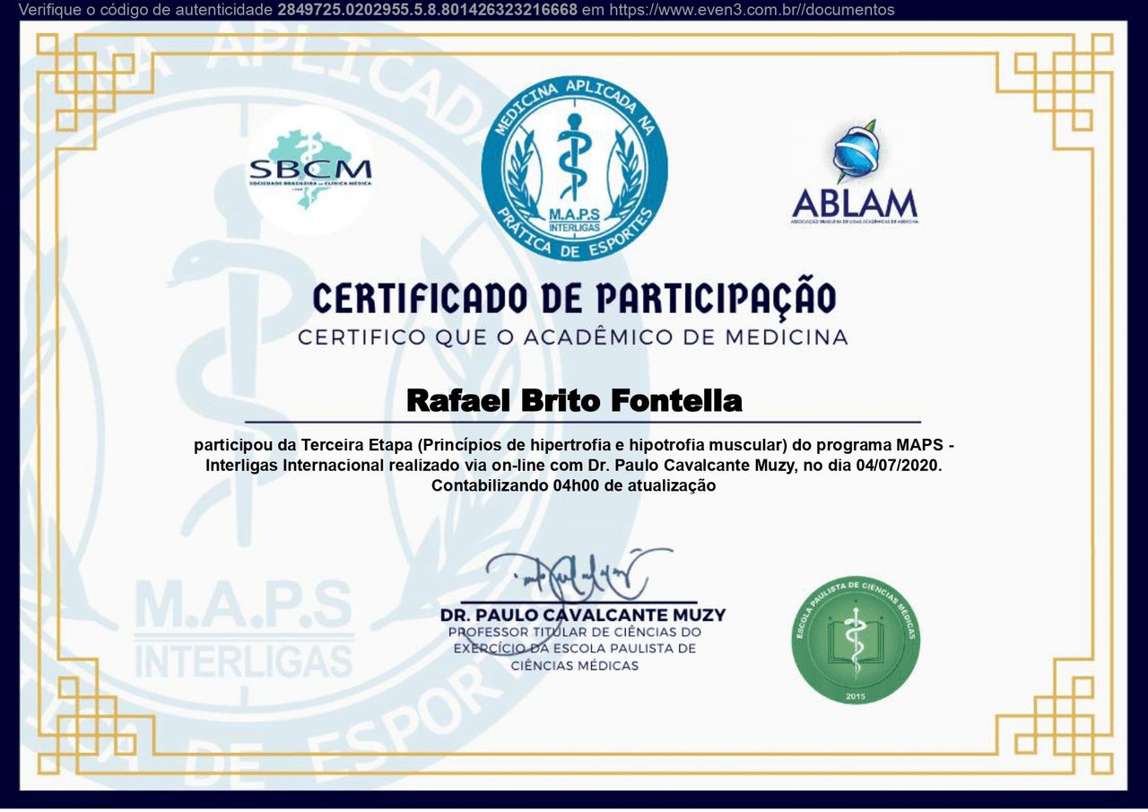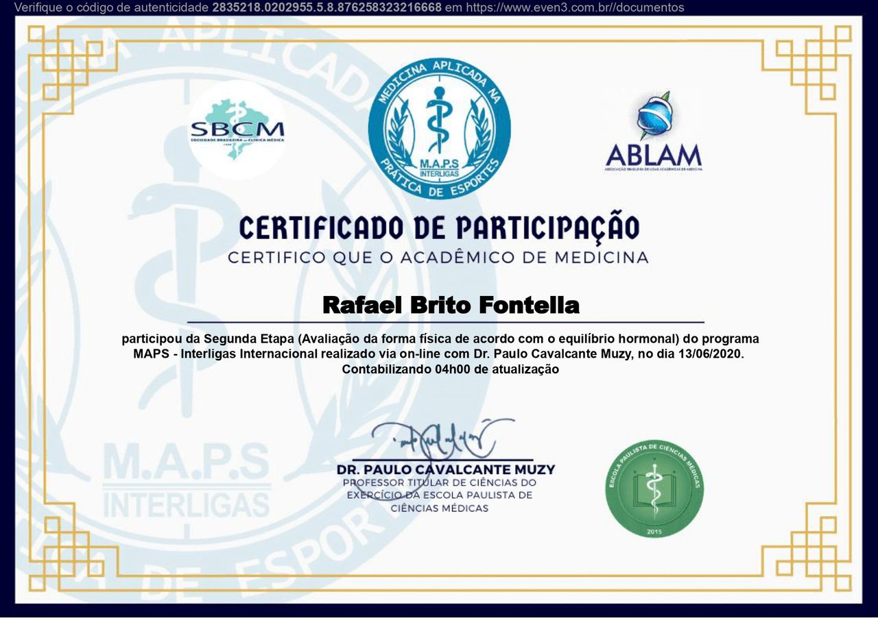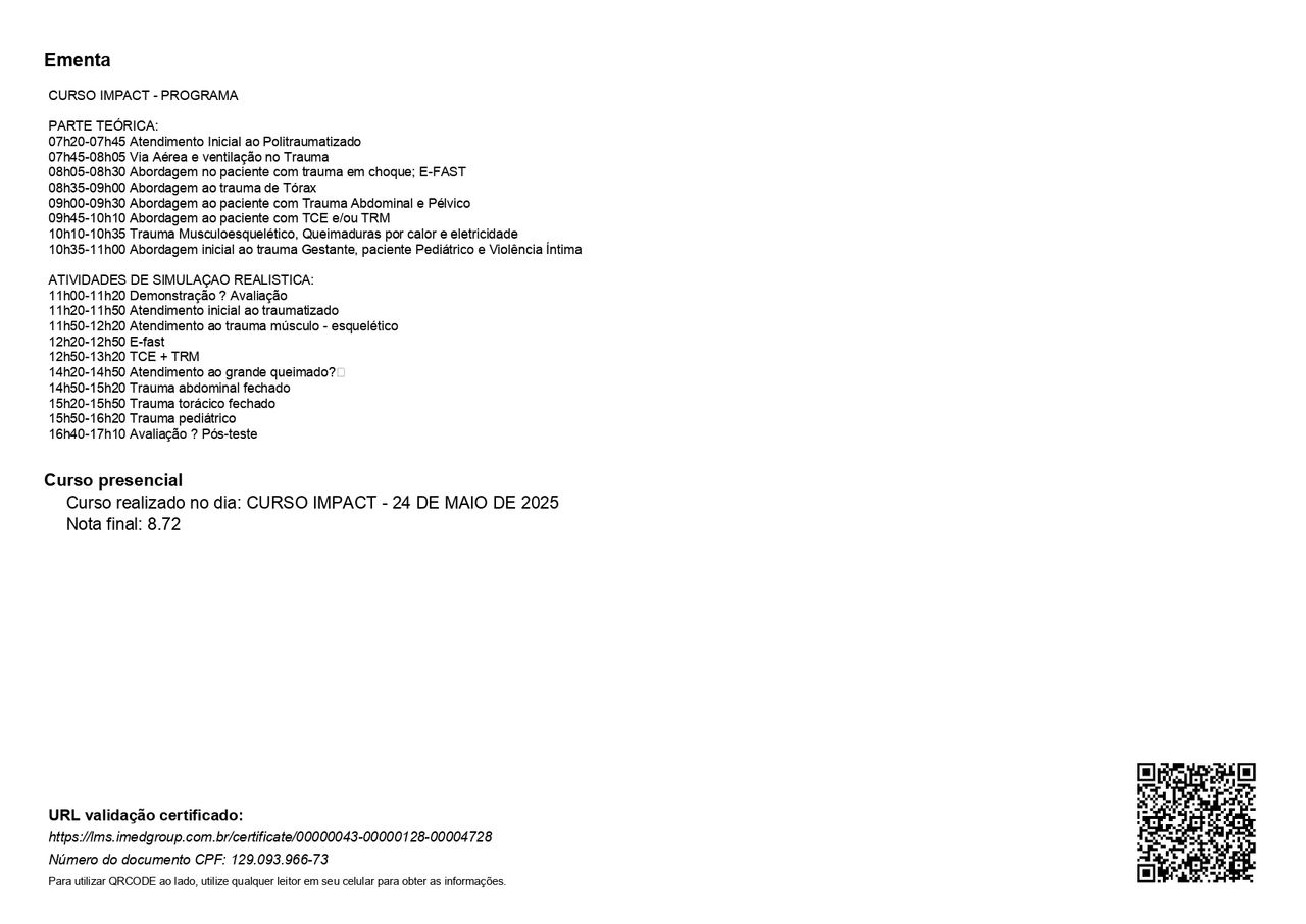 PALS - Suporte Avançado de Vida em Pediatria, HAPTUS - Curso de Habilidades Práticas no Treinamento de Ultrassonografia, IMPACT - Imersão no Atendimento ao Paciente com Trauma, RESCUE - Revisão de Condutas em Urgência e Emergência, ACEVE - Acesso Vascular Ecoguiado, ACLS - Suporte Avançado de Vida Cardiovascular, Via Aérea Avançada - Supraglóticos e Cricotireoideostomia, MAPS - Interligas Internacional (Medicina Aplicada na Prática de Esportes) UNIFESP/ Dr. Paulo Cavalcante Muzy, Manejo de Antibióticos, Manejo clínico da COVID-19 na Atenção Especializada, Orientações gerais ao paciente com COVID-19 na Atenção Primária à Saúde, Síndrome Gripal e COVID-19 / Instituto Sírio-Libanês de Ensino e Pesquisa, Introdução à Ventilação Mecânica / Instituto Sírio-Libanês de Ensino e Pesquisa.