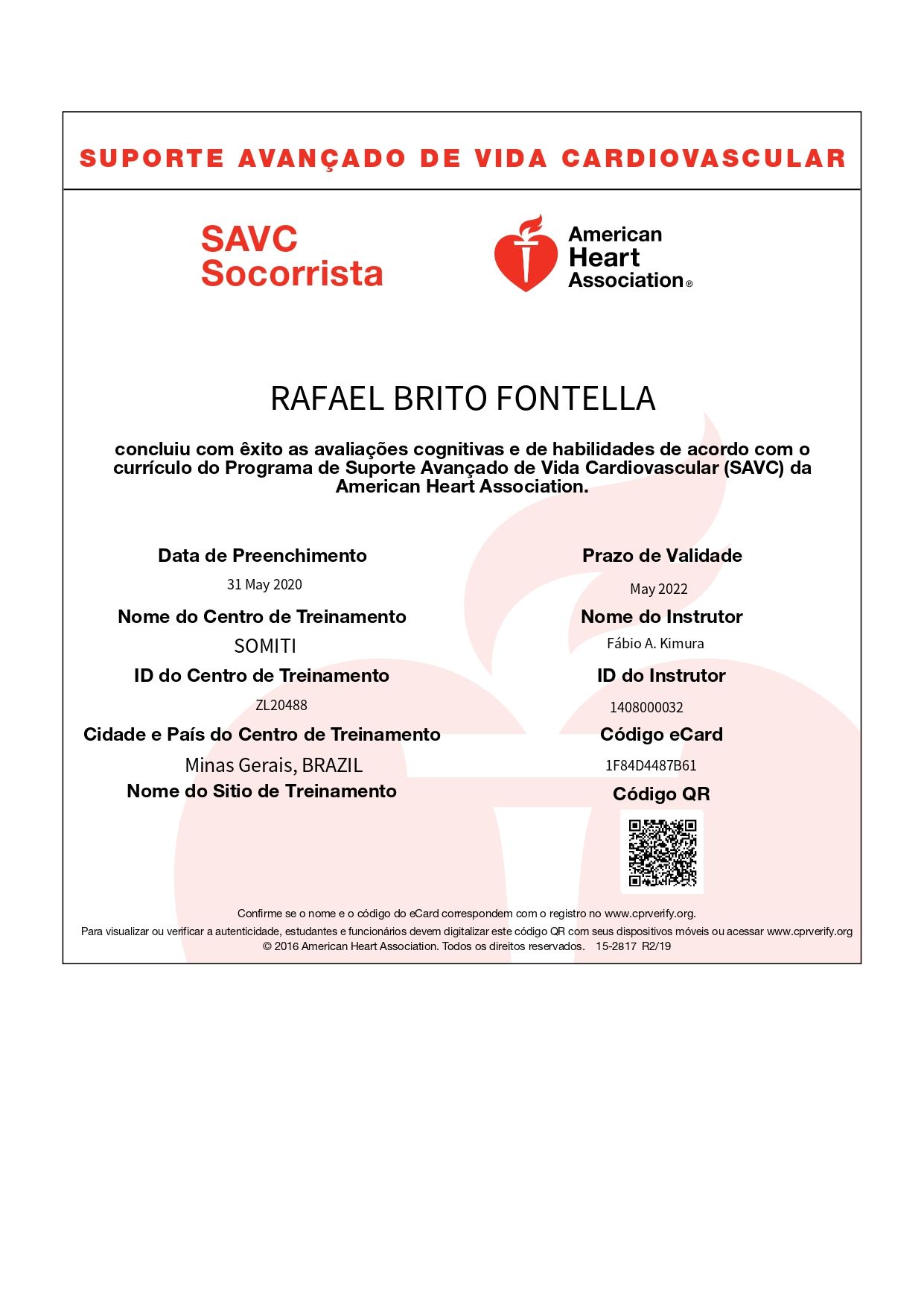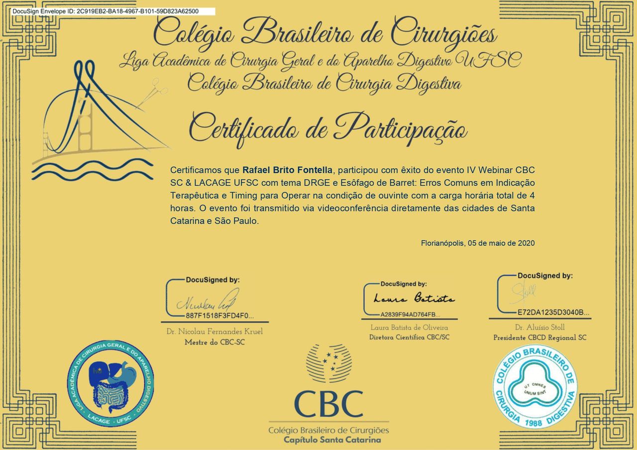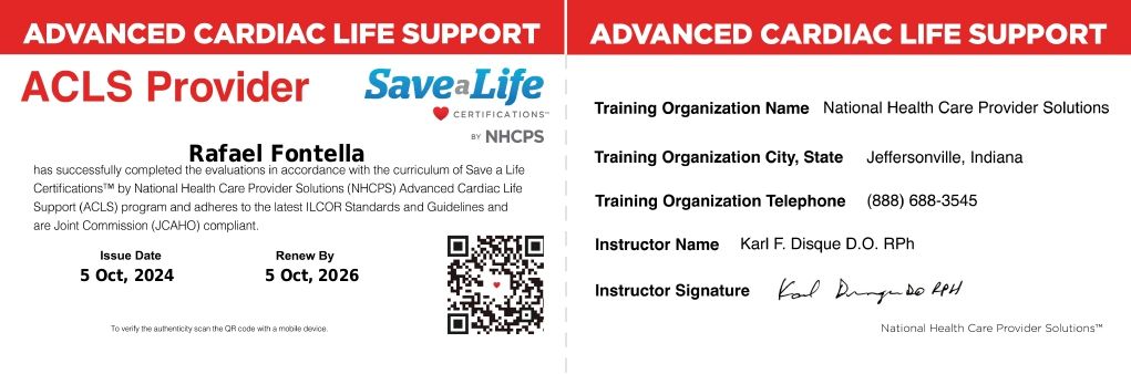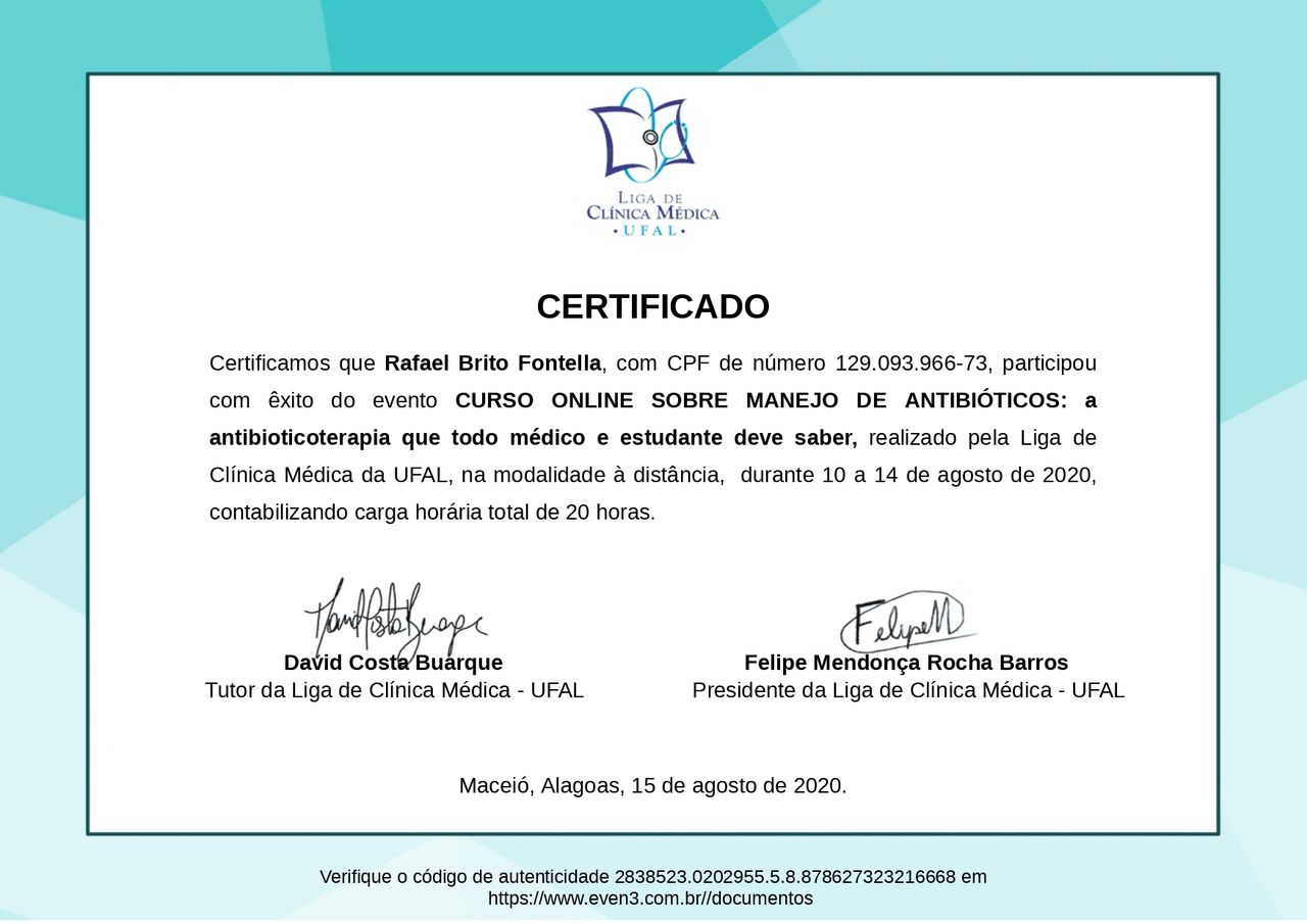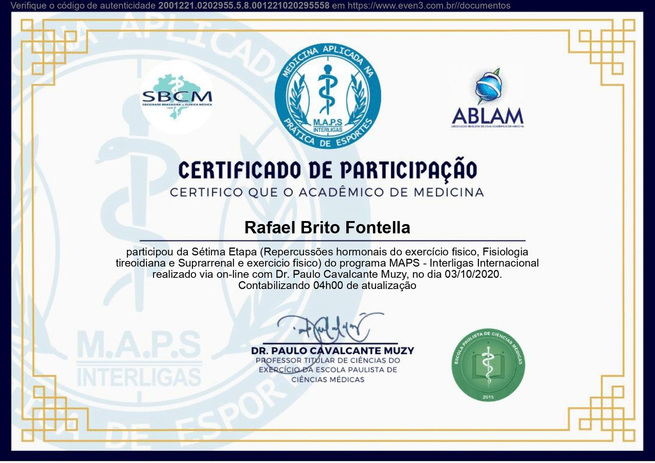 PALS - Suporte Avançado de Vida em Pediatria, HAPTUS - Curso de Habilidades Práticas no Treinamento de Ultrassonografia, IMPACT - Imersão no Atendimento ao Paciente com Trauma, RESCUE - Revisão de Condutas em Urgência e Emergência, ACEVE - Acesso Vascular Ecoguiado, ACLS - Suporte Avançado de Vida Cardiovascular, Via Aérea Avançada - Supraglóticos e Cricotireoideostomia, MAPS - Interligas Internacional (Medicina Aplicada na Prática de Esportes) UNIFESP/ Dr. Paulo Cavalcante Muzy, Manejo de Antibióticos, Manejo clínico da COVID-19 na Atenção Especializada, Orientações gerais ao paciente com COVID-19 na Atenção Primária à Saúde, Síndrome Gripal e COVID-19 / Instituto Sírio-Libanês de Ensino e Pesquisa, Introdução à Ventilação Mecânica / Instituto Sírio-Libanês de Ensino e Pesquisa.